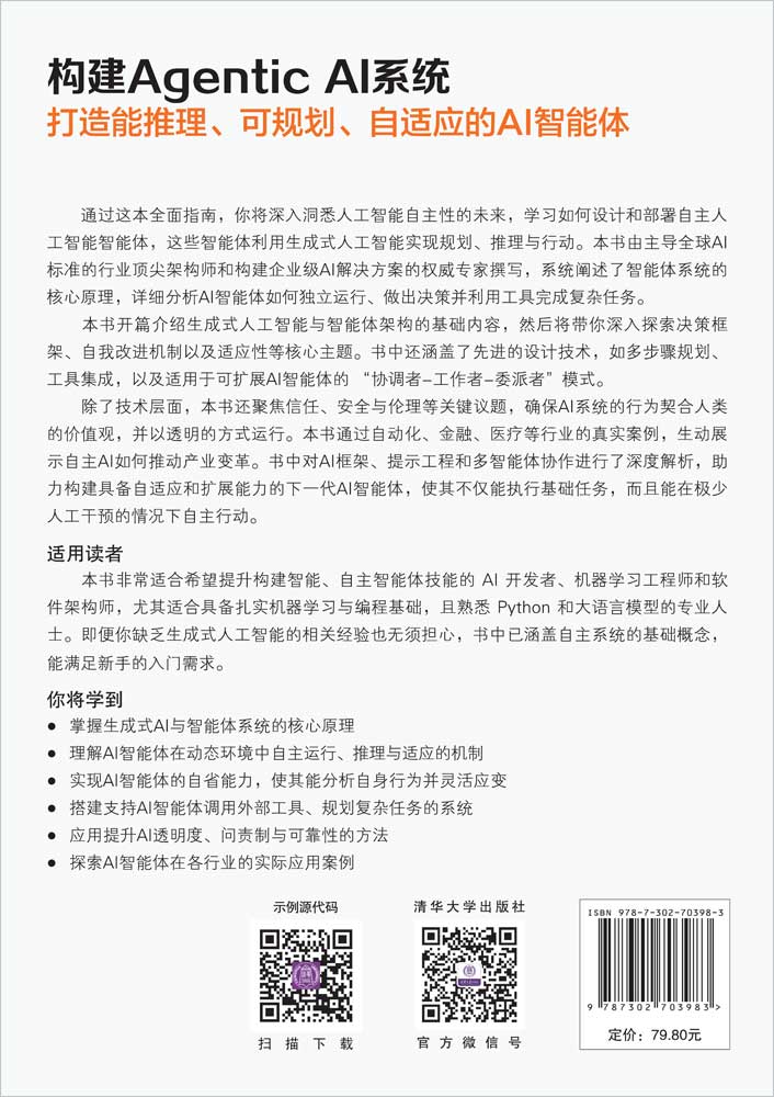 中文版推荐序 当前,人工智能正从“工具赋能”迈向“原生智能”的新阶段,以大模型、Agent、RAG等为代表的AI技术不再局限于为传统系统叠加功能,而是通过重构底层架构与运行逻辑,催生全新智能化应用形态。2025年8月国务院发布的《关于深入实施“人工智能+”行动的意见》更明确要求“培育智能原生新模式新业态,大力发展智能原生技术、产品和服务体系,加快培育底层架构和运行逻辑基于人工智能的智能原生企业”,凸显了这一领域的战略地位。 本书所介绍的Agentic AI系统正是一种典型的新型智能化软件系统。这种系统以基于大模型的智能化和自治性的Agent为中心,能推理、会规划、自适应。除此之外,这里的“系统”二字又突出了面向真实场景和现实需求的工程化要求:从外部用户需求看,这类系统需要具有高度的可信性,满足可靠性、安全性、透明性、可解释性以及伦理道德等多个方面的要求;从内部构造方式看,这类系统包含大模型、Agent、知识库、工具等多种不同类型的组成部分,并且包含一系列最佳实践和设计模式。简而言之,就是要通过使用工程化的方法和手段实现高度可信的工程化系统。 本书围绕这一主题,从基本原理、关键技术、设计模式、构造方法、可信保障等多个方面展开介绍,并提供了具体的案例分析和实现参考,为Agentic AI系统方面的初学者提供了一个全面和专业性的介绍。本书特别突出了智能体系统设计的重要性,包括相关设计模式和设计技巧,这对于工程化系统无疑是特别重要的。同时,本书还特别强调了Agentic AI系统的信任、伦理和安全问题。在人工智能特别是Agentic AI技术加速融入每个人的日常生活以及各行各...