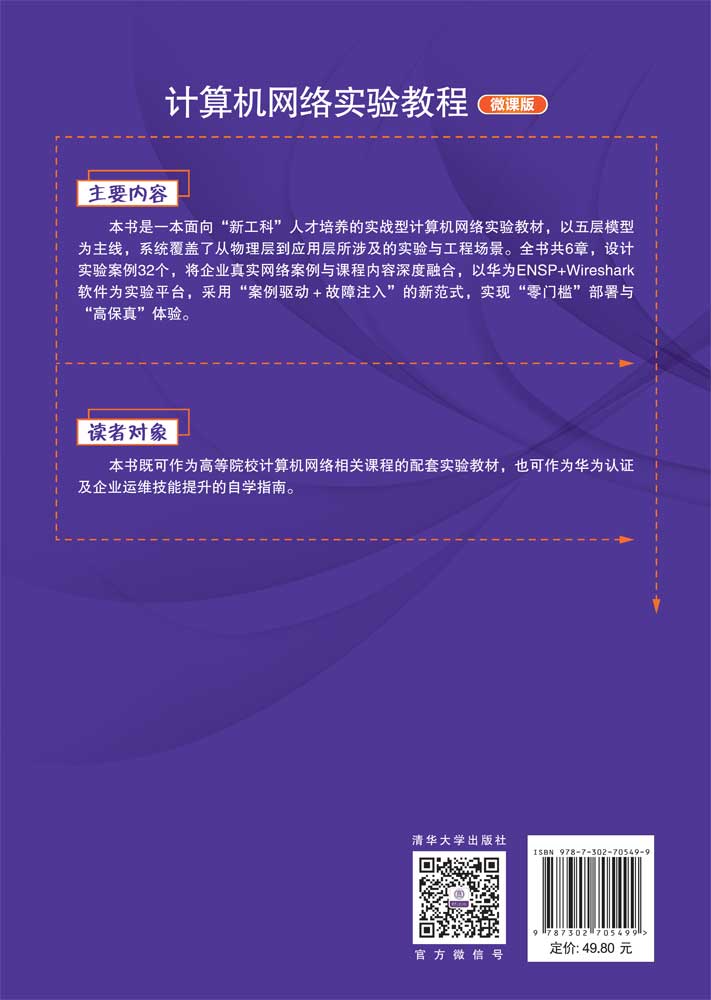 "《计算机网络实验教程》是一本面向“新工科”人才培养的计算机网络实验教材,以五层模型为主线,系统介绍了从物理层到应用层所涉及的实验与工程场景。本书共分6章,32个实验案例,将企业真实网络案例与课程内容深度融合,以华为eNSP+Wireshark软件为实验平台,采用“案例驱动+故障注入”的新范式,实现“零门槛”部署与“高保真”体验。实验内容梯度清晰,从基础型(验证原理)、提高型(综合配置)到拓展型(故障排除与创新设计),教师可按学时、学生水平自由裁剪。 本书实验丰富、典型,所有实验均提供理论视频讲解、完整步骤截图、故障现象剖析、实验总结分析以及习题思考探索等,既可用于高等院校计算机网络相关课程的配套实验教材,也可作为华为认证及企业运维技能提升的自学指南。"