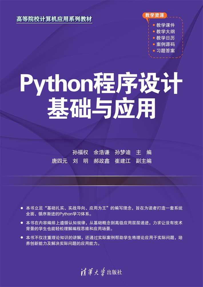 "《Python程序设计基础与应用》提供系统、全面的python入门指导,通过短小精悍的基础示例呈现语法的作用和使用要点。本书减少传统教材中晦涩的底层原理与复杂语法细节的讲解比重,从Python语言简介与环境搭建入手,逐步覆盖语法基础、程序控制结构、组合数据类型、函数定义与使用等核心知识,再延伸至模块与库、文件处理、网络爬虫、数据分析与可视化等应用技能,每个章节都配有清晰的示例代码、详细的步骤说明与针对性习题。 本书由浅入深、层层递进,不仅注重理论知识的讲解,还通过实际案例和项目实践帮助学生将理论应用于实际问题。在内容编排上遵循认知规律,从基础概念到高级应用层层递进,采用通俗易懂的语言,避免复杂的公式和术语,力求让没有技术基础的学生也能轻松理解python编程思维和应用场景。 本书旨在为高等院校的学生提供一本通俗易懂、内容全面的python编程入门教材,适用于非工科类专业作为公共计算机教学用书,也可作为非计算机专业学生的程序设计课程教材,还可以作为办公自动化和数字媒体技术相关从业人员的自学用书。"