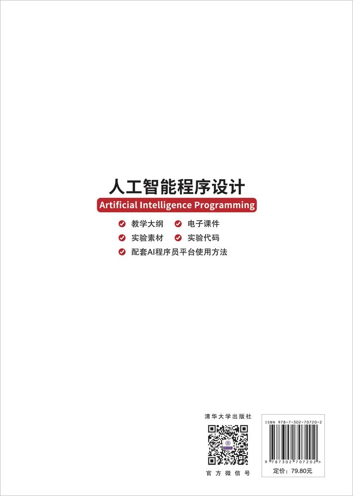 《人工智能程序设计》内容简单、易懂、容易上手实现。本书在线上实验平台的辅助下,图文并茂,以简单的小实例讲解带领读者进入人工智能辅助程序设计的领域。相信读者能够跟随本书,快速地掌握人工智能程序设计的方法,快速开发即用即抛的小型应用程序,以满足日常生活、工作等方面的需求。