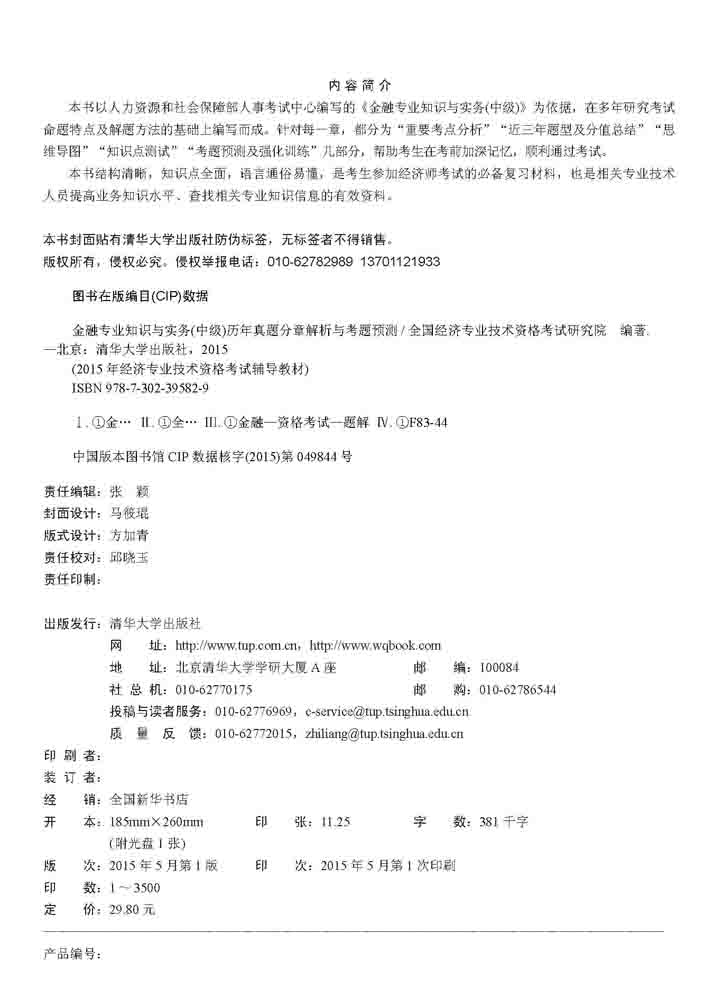 本书以人力资源和社会保障部人事考试中心编写的《金融专业知识与实务(中级)》为依据,在多年研究考试 命题特点及解题方法的基础上编写而成。针对每一章,都分为“重要考点分析”“近三年题型及分值总结”“思 维导图”“知识点测试”“考题预测及强化训练”几部分,帮助考生在考前加深记忆,顺利通过考试。 本书结构清晰,知识点全面,语言通俗易懂,是考生参加经济师考试的必备复习材料,也是相关专业技术 人员提高业务知识水平、查找相关专业知识信息的有效资料。