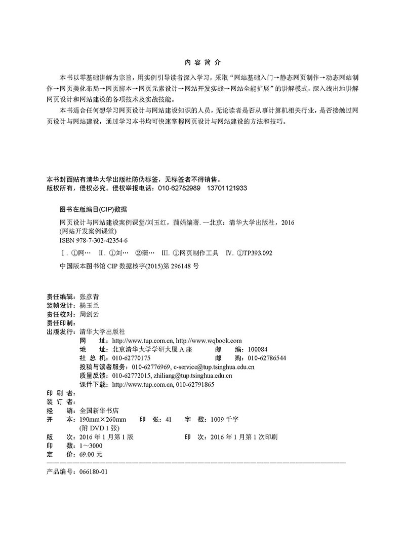 本书以零基础讲解为宗旨,用实例引导读者深入学习,采取“网站基础入门→静态网页制作→动态网站制作→网页美化布局→网页脚本→网页元素设计→网站开发实战→网站全能扩展”的讲解模式,深入浅出地讲解网页设计和网站建设的各项技术及实战技能。 本书适合任何想学习网页设计与网站建设知识的人员,无论读者是否从事计算机相关行业,是否接触过网页设计与网站建设,通过学习本书均可快速掌握网页设计与网站建设的方法和技巧。