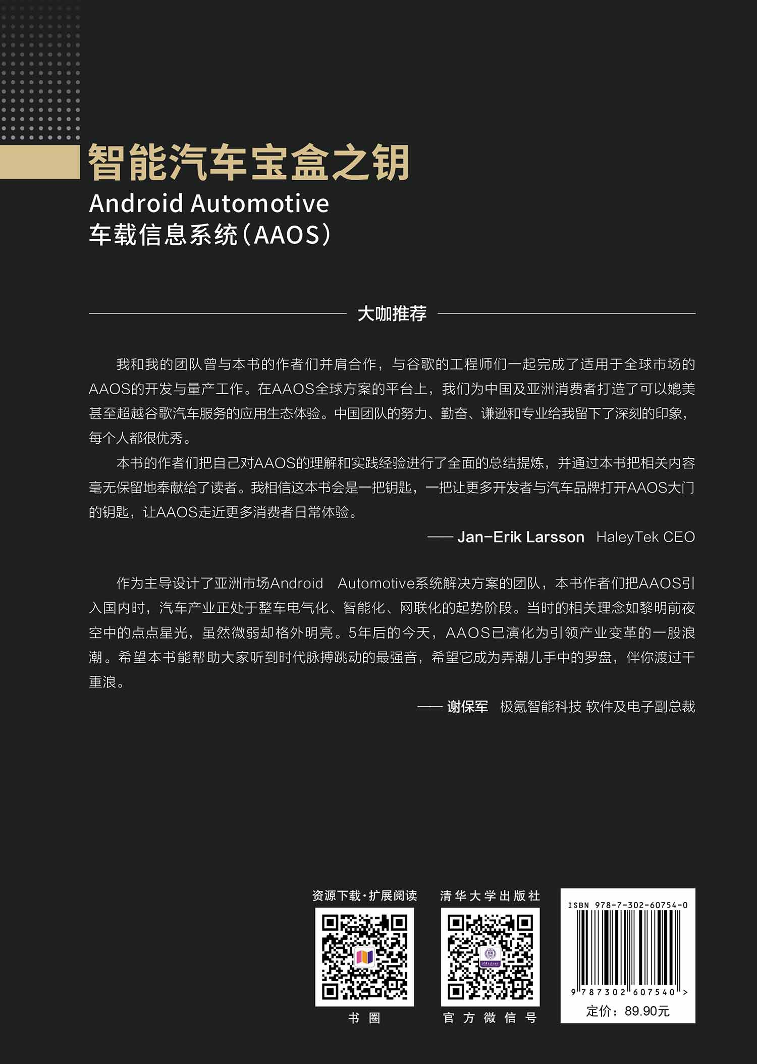 Android Automotive OS(AAOS)是谷歌公司基于Android系统和生态推出的面向车载信息娱乐领域的操作系统。 本书详细介绍了Android Automotive OS的设计与实现,内容涵盖了系统开发、应用开发、产品管理等各层面的知识。全书共15章。第1章介绍了车载信息娱乐系统的发展历程及主流的操作系统; 第2章介绍了与汽车相关的Android产品和版本变迁; 第3章介绍了开发环境搭建、工具使用以及源码的获取; 第4~12章从系统框架的角度分析了Android Automotive OS中主要服务的实现原理和用法; 第13章讲解了语音、导航和媒体这三类应用的开发; 第14、15章介绍了产品管理的相关内容,包括应用集成、兼容性测试。 本书结构清晰,实例丰富,通过通俗易懂的文字和丰富的配图,能够让读者深入了解Android Automotive OS的设计思想。从实际应用的需求出发,适合所有Android系统工程师、Android应用开发工程师阅读。