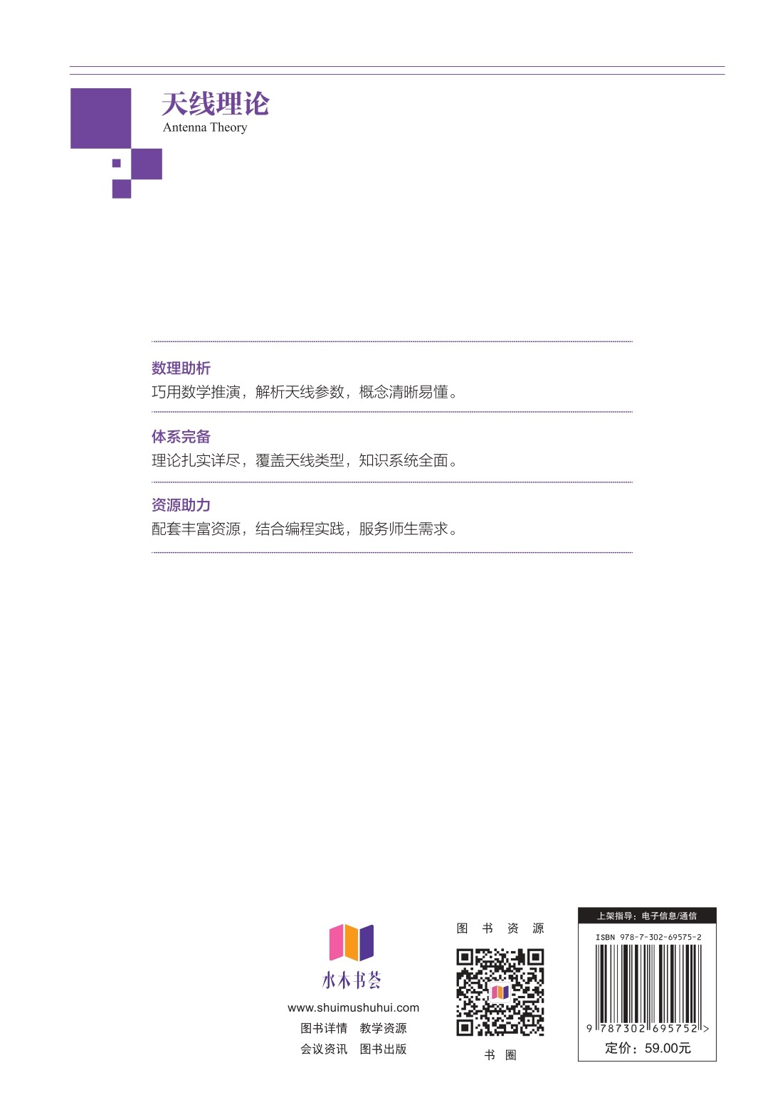 前言 “天线理论”是高等院校电子工程、集成电路、通信工程和电子信息专业的一门重要的专业基础理论课程。本书从天线理论的最基本原理和分析方法出发,详细而系统地对天线理论的相关知识及典型常用的天线进行了介绍。 第1章为天线基础知识,内容较为详尽,使学生可以很好地掌握天线理论的基础知识。第2章均匀媒质中的对称振子及相关天线、第4章驻波天线和第5章宽带天线为线天线的相关内容。第3章为天线阵的分析与综合,给出了折合振子天线等天线阵理论应用的例子以及导电地面对附近天线性能影响的分析。第6章为面状天线,由于分析原理类似,本章中也包含了缝隙天线和微带天线的内容。 书中充分利用数学工具,通过数学的推导,可以更加容易地理解各种天线参数的计算和概念。教材内容具有较强的系统性、逻辑性和全面性。第1章、第3章和第6章的基础理论部分知识内容较为详尽,使学生可以打下坚实的天线理论基础。通过对所推得公式的分析,将其中所包含的物理概念清晰地展现给读者,使读者能更好地掌握天线的物理概念。通过对各类天线的分析与介绍,使读者可以较为全面地掌握天线的各种类型。 通过任课教师在教学中对内容的取舍,本书可以适用于不同专业、不同学时的课程。本书的参考学时为50~70学时,也可根据不同专业或研究方向的要求有所侧重。为方便教学,编者已完成与本书相配套的电子课件、习题详解及其他相关资料,可赠送给使用本书的任课教师。通过书中的二维码可观看和下载相关扩展的教学资源。 本书由北京邮电大学电子工程学院姚远教授、丌丽梅教授和西安电子科技大学天线与电磁散射研究所傅光教授审阅,在此表示...