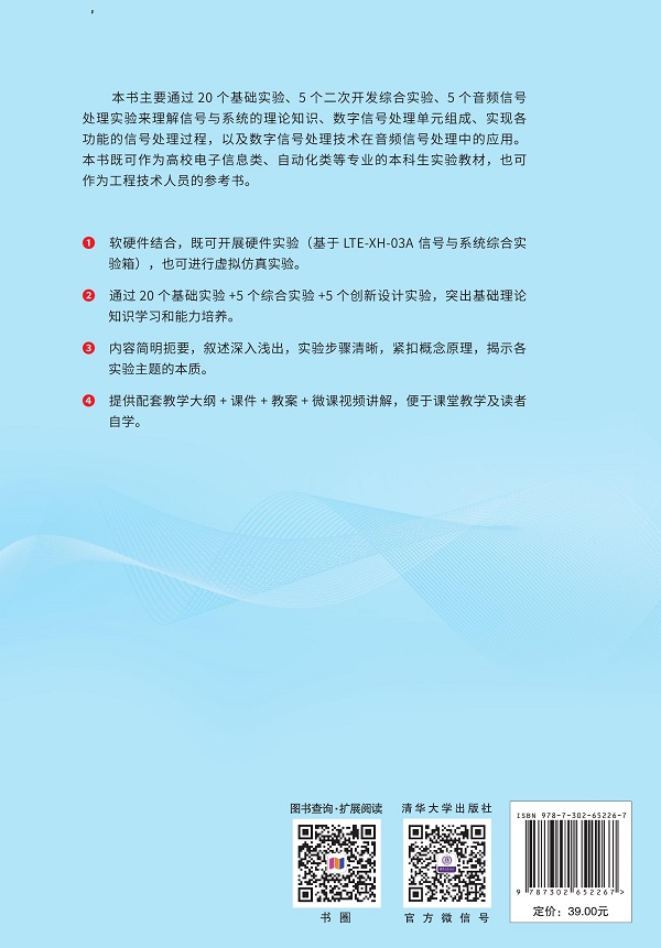 前言 “信号与系统”是电子信息类专业的一门重要的专业基础课程,而实验又是学习这门课程的重要实践环节,对于学生的实践动手能力、分析能力、创新能力的培养和提高具有重要的作用。为了适应现代教学的要求,我们在总结多年的教学实践和教学改革经验的基础上编写了《信号与系统实验教程(微课视频版)》,书中实验项目以LTEXH03A信号与系统综合实验箱为支撑,同时兼顾虚拟仿真实验项目需求。与以往的实验教材比较,本书在宗旨和内容上都有了较大改变,除了保持必需的基础实验外,还增加了扩展实验,旨在更有效地培养学生的实验技能和创新能力,促进学生全面而富有个性的发展。 本书共4章,第1章为信号与系统综合实验概述,主要介绍了LTEXH03A信号与系统综合实验箱和各实验模块。LTEXH03A信号与系统综合实验箱是专门为“信号与系统”课程设计的,基于多年的教学实践,不断改进调整,提供了信号的时域、频域分析等实验手段。第2章安排了20个信号与系统的基础实验,加深学生对所学信号与系统的理论知识的理解,帮助学生掌握各类信号的产生及测试方式,各类电信号的分解、合成的设计方法,各类电信号的模拟设计方法,通过“做中学”与“学中做”,逐步获得知识、掌握技能。第3章安排了5个信号与系统的二次开发综合实验,不仅包括功能实现的实验,使学生掌握一些电路系统的典型应用,培养学生独立设计实验和综合实验的能力,还包括系统调试方法的实验,进一步培养学生解决实际问题的能力。第4章安排了5个音频信号处理实验,以语音信号为例,加强学生对信号采集、计算、分析过程的理解,为实际应用提供支撑。 本书提供了实验参考技...