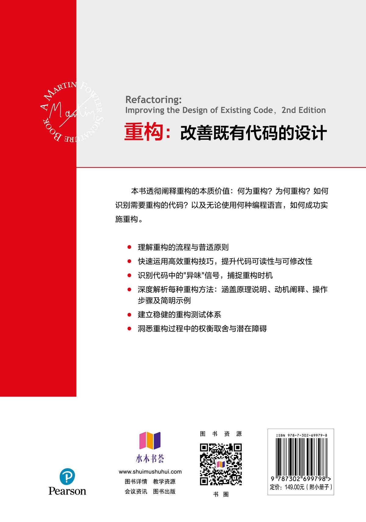 第一版前言 “重构”最初是在Smalltalk圈子中构思出来的,但不久之后就进入了其他编程语言的阵营。由于重构是框架开发不可或缺的一部分,因此“框架工作者”在谈论他们的技术时,经常会提到“重构”一词。当他们改进类层次结构时,当他们需要删除多少行代码时,都会提到这个术语。框架工作者深知,好的框架不是一蹴而就的—随着经验的积累,框架需要不断地进行优化和调整。他们还知道,代码的读取和修改频率高于新代码的编写频率。保持代码可读性和易修改性的关键就是重构—特别是对于框架而言。当然,对于一般软件而言也是如此。 那么,重构有什么弊端吗?当然,“重构是有风险的”。它需要修改代码,这可能会引入细微的Bug。如果重构做得不正确,可能会导致代码回滚到数周之前的版本。此外,非正式或临时实施重构时,风险会更大。重构是基于对代码的深入研究的,研究的过程中你会发现待重构的点,研究越深入,发现的待重构的点就越多……做出的改变也就越多。最终,你会陷入一个无法自拔的深渊。为了避免自掘坟墓,必须系统地进行重构。当我和合著者撰写《设计模式》时,曾提到:“设计模式为重构提供了目标。”但是,确定目标只是问题的一部分;转换代码以达到目标则是另一个挑战。 Martin Fowler和其他作者通过阐明重构过程,为面向对象的软件开发做出了宝贵的贡献。本书解释了重构的原则和最佳实践,并指出了何时何地应该开始深入研究代码以改进它。本书的核心是一份全面的重构目录。每个重构都描述了经过验证的代码转换的动机和做法。一些重构手法(例如提取方法或移动字段)可能看起来会很明显。 理解此类重构的机制是以规范的方式进行重构的关键。本书中...
