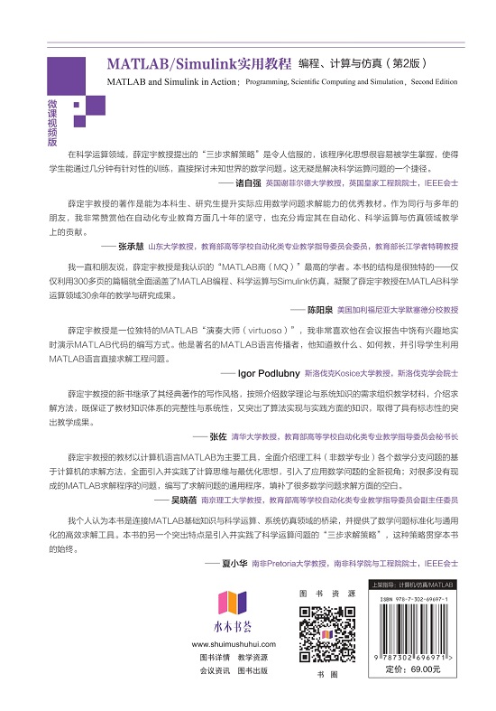 "本书系统地介绍科学研究与工程应用领域使用广泛的 MATLAB语言,全面介绍其基本编程方法,包 括数据结构、语句结构、流程控制、函数编写、图形绘制与面向对象编程技术等,并介绍 MATLAB语言在微 积分、线性代数、代数方程、微分方程、**化与数据处理领域的问题求解方法;本书还介绍基于 Simulink 的系统建模与仿真方法. 本书适合理工科各专业本科生、研究生以及工程技术人员学习 MATLAB语言,并利用 MATLAB 语 言解决科学运算、系统建模与仿真方法等问题."