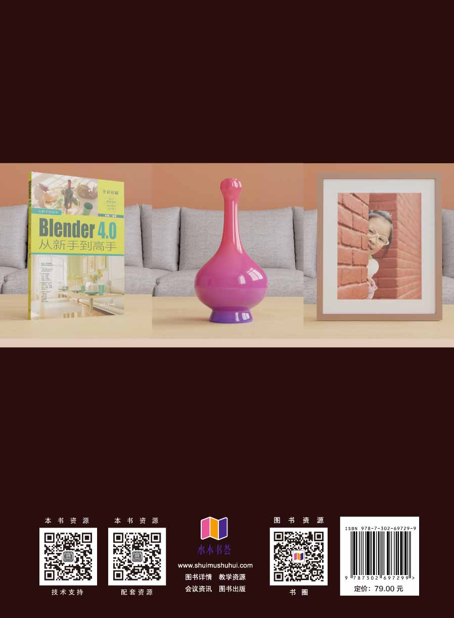 "Blender软件旨在为广大三维动画师提供了功能丰富、强大的动画工具来制作优秀的动画作品。本书主讲如何使用中文版blender软件来进行三维动画制作的技术书籍。全书共分为9章,包含了界面组成、模型制作、灯光技术、摄影机技术、材质贴图、渲染技术、粒子系统、AI插件等一系列三维动画制作技术。本书结构清晰、内容全面、通俗易懂,各个章节均设计了相对应的实用案例,并详细阐述了制作原理及操作步骤,注重提升读者的软件实际操作能力。另外,本书附带的教学资源内容丰富,包括本书所有案例的工程文件、贴图文件和多媒体教学录像,便于读者学以致用。 "