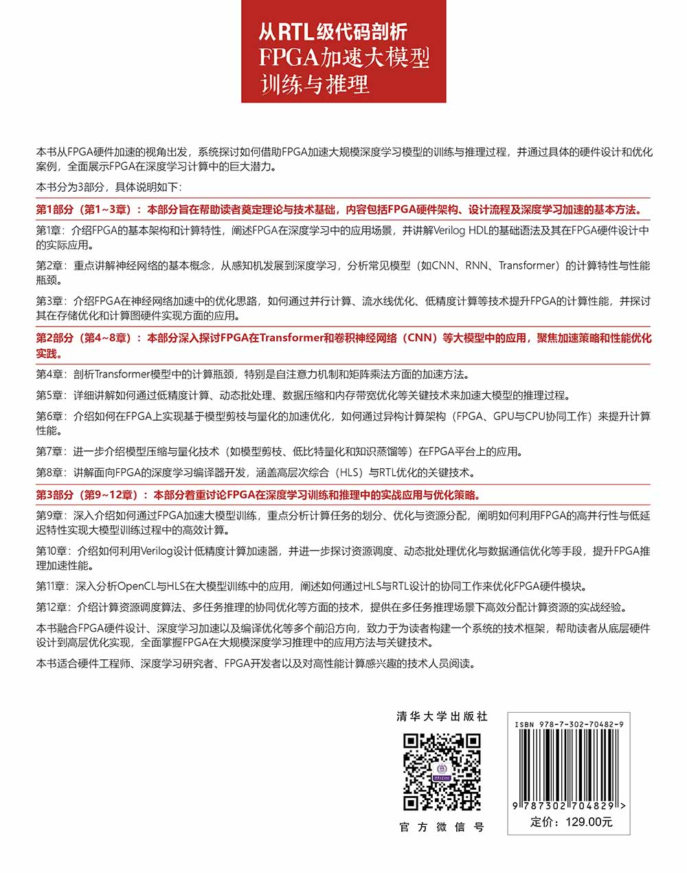 全书以 “基础 — 应用 — 实战” 的逻辑层层递进:第一部分系统梳理 FPGA 硬件架构、Verilog 编程基础与深度学习模型计算特性,破解 “硬件与算法如何适配” 的核心疑问;第二部分直击大模型加速痛点,针对 Transformer、CNN 等主流模型,深入剖析并行计算、低精度量化、模型压缩等关键优化技术,更涵盖异构计算、编译器开发等前沿方向;第三部分通过训练任务优化、推理性能调优、多任务资源调度等实战案例,将 RTL 设计、HLS 开发等技术落地为可复用的工程经验。
