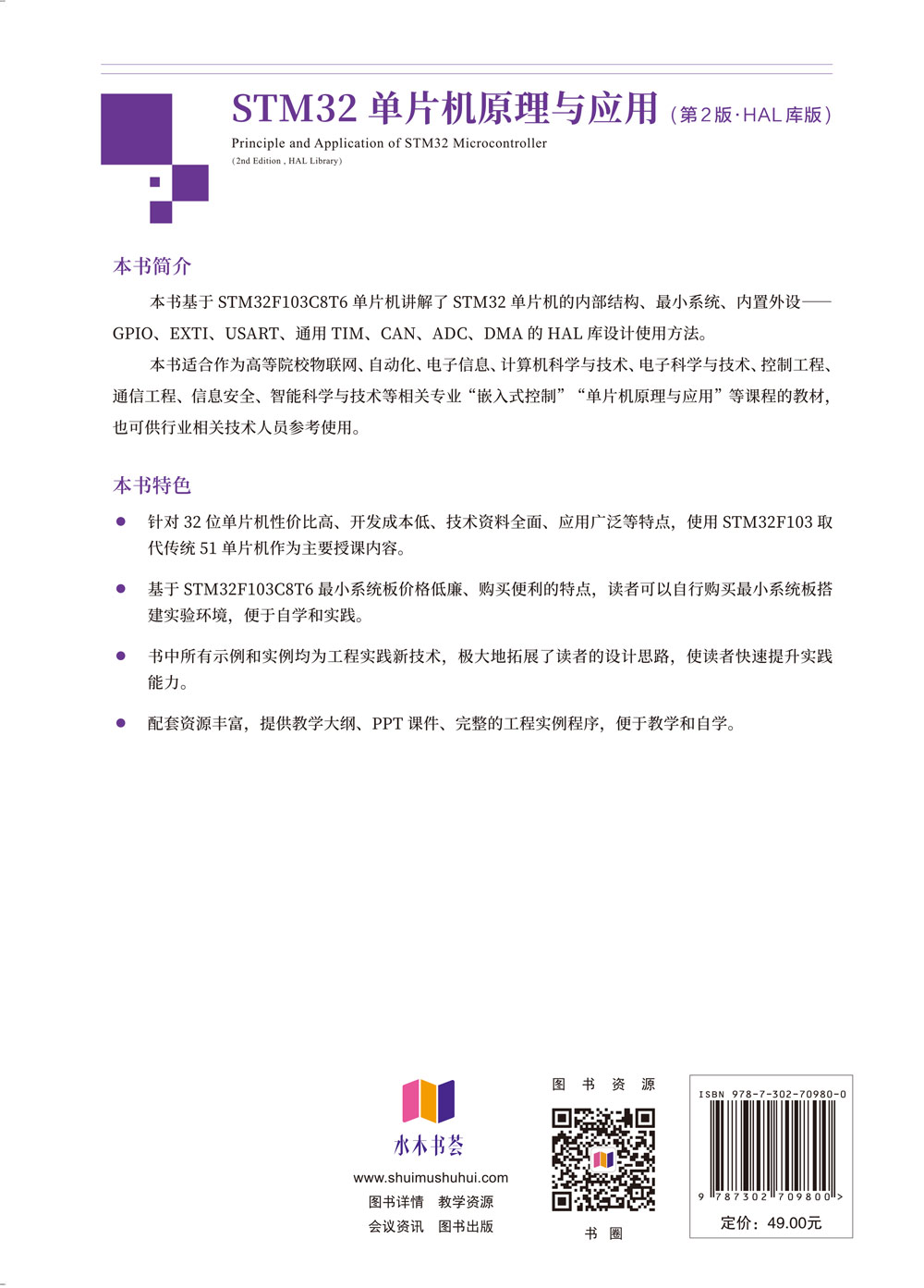 "本书基于STM32F103C8T6单片机讲解了STM32单片机的内部结构、最小系统、内置外设——GPIO、EXTI、USART、通用 TIM、CAN、ADC、DMA 的 HAL库设计及使用方法。第2版使用了HAL库代替第1版使用的“库函数”进行设计开发,HAL库可以方便地实现同一个程序在不同型号STM32芯片上的移植和重用。 本书适合作为高等院校物联网、自动化、电子信息、计算机科学与技术、电子科学与技术、控制工程、通信工程、信息安全、智能科学与技术等相关专业“嵌入式控制”“单片机原理与应用”等课程的教材,也可供行业相关技术人员参考使用。"