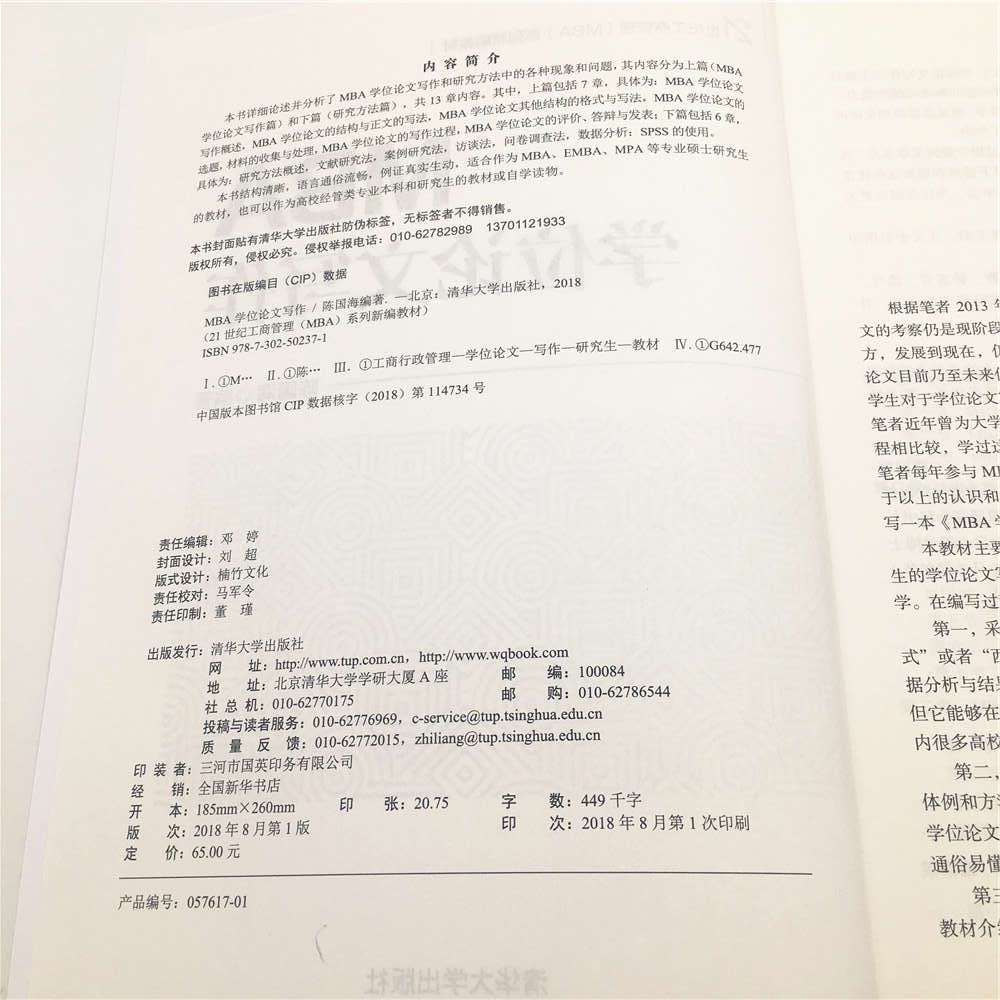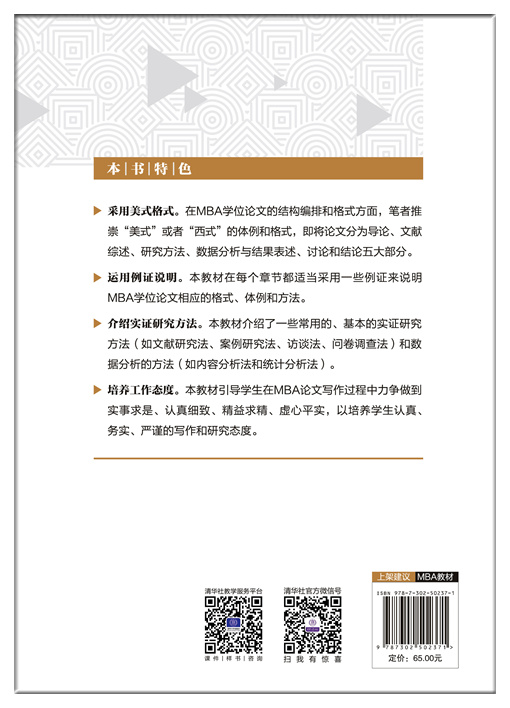 《MBA学位论文写作》详细论述并分析了MBA学位论文写作和研究方法中的各种现象和问题,其内容分为上篇(MBA学位论文写作篇)和下篇(研究方法篇),共13章内容。其中,上篇包括7章,具体为:MBA学位论文写作概述,MBA学位论文的结构与正文的写法,MBA学位论文其他结构的格式与写法,MBA学位论文的选题,材料的收集与处理,MBA学位论文的写作过程,MBA学位论文的评价、答辩与发表;下篇包括6章,具体为:研究方法概述,文献研究法,案例研究法,访谈法,问卷调查法,数据分析:SPSS的使用。 本书结构清晰,语言通俗流畅,例证真实生动,适合作为MBA、EMBA、MPA等专业硕士研究生的教材,也可以作为高校经管类专业本科和研究生的教材或自学读物。