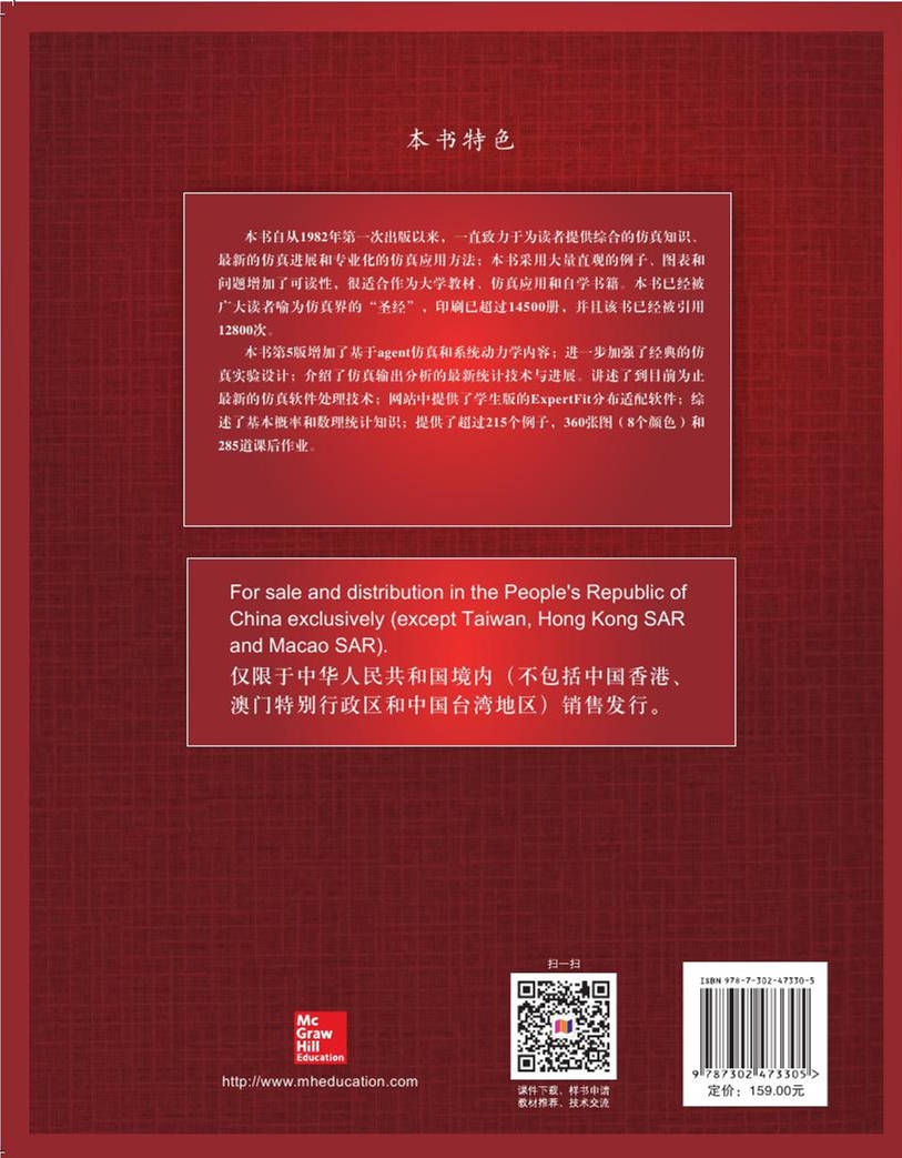 本书采用大量直观的例子、图表和问题增加了可读性,很适合作为大学教材、仿真应用和自学书籍。本书第5版增加了基于agent仿真和系统动力学内容;进一步加强了经典的仿真实验设计;介绍了仿真输出分析的最新统计技术与进展。讲述了到目前为止最新的仿真软件处理技术;网站中提供了学生版的ExpertFit分布适配软件;综述了基本概率和数理统计知识;提供了超过215个例子,360张图(8个颜色)和285课后作业。