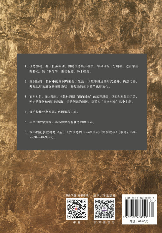 本教材侧重于培养学生使用Java语言进行面向对象程序设计的思路和技能,而并非对Java技术进行百科全书式的介绍。本教材以初学者为起点,对面向对象思想进行深入透彻的剖析。全书用16个任务作为引子,通过对任务的分析,引入相关的知识和技术,同时精选了大量的生活案例来形象地溶解知识,在学习和掌握了相关知识的基础上,通过任务实施环节来完成任务描述中提出的任务,从而达到强化技能培养的目标。为使内容通俗易懂,激发学生的学习兴趣,教材中的任务通过口语化的语言将抽象的知识形象化,增强学生对知识的理解与运用。 全书共分3篇: 第1篇(第1~5章)为Java入门篇,着重介绍Java语言所涉及的基本概念、流程控制、数组等基础知识;第2篇(第6~10章)为面向对象基础篇,着重讨论面向对象的三大特征,即封装、继承、多态,以及接口、异常处理等面向对象的基础知识;第3篇(第11~16章)为Java进阶篇,着重介绍Java集合框架、图形用户界面、I/O流、多线程、网络编程、数据库编程等面向对象高级技术。 本教材的读者对象定位于高校计算机相关专业的本科生、大专生或是从事Java软件开发及相关领域的初级工程技术人员,旨在培养读者面向对象的分析问题和解决问题的能力,从而适应信息化时代的需求。