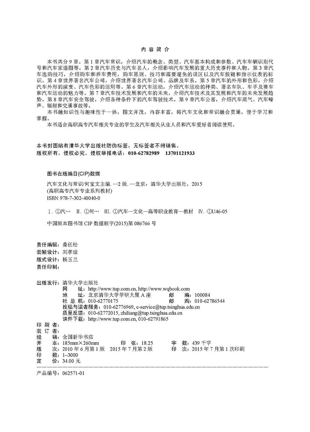第2版前言 《汽车文化与常识》自2010年面市至今,受到了各院校汽车相关专业师生和广大汽车爱好者的欢迎。面对新的汽车工业发展形势,《汽车文化与常识》也有必要更新再版,以增添新的适应当今读者需求的内容,更好地普及汽车文化知识,以适应汽车爱好者的要求。为此我们在原版的基础上更新编写出《汽车文化与常识》第2版。 汽车诞生至今已有100多年,其发展迅速,影响深远。当今世界,汽车工业在世界经济发展中的地位越来越重要,汽车对社会经济的影响也越来越大。 自2009年以来,我国汽车产、销量超过1000万,超过美国成为世界第一产、销大国。近几年来一直以每年近2000万产、销量保持着世界第一。我国已经成为汽车化的国家。 这样,普通百姓对汽车基本知识和汽车文化的需求与日俱增。而对高职高专的学生而言,了解这些内容则是基本要求。为此,我们按照职业技术教育的特点和培养方案,本着“适用、管用、够用”的原则,编写了本书。 全书共分为9章,主要内容包括:汽车常识,汽车历史与汽车名人,汽车选购技巧,世界著名汽车公司,汽车的外形和色彩,汽车运动,汽车技术发展和汽车的未来,汽车安全驾驶,汽车公害等。 参加本书编写的有:北京现代职业技术学院何宝文(第1章)、朱福顺(第2章)、尹丽丽(第3章)、吴静(第9章),邢台职业技术学院陈超(第5章)、刘学明(第8章),河北工业职业技术学院闫炳强(第4章),河北机电职业技术学院杨立云(第6章)、李文涛(第7章)。邢台职业技术学院李美丽、胡慧敏负责插图工作。本书由何宝文、刘学明担任主编,陈超、闫炳强、杨立云担任副主编。 在本书的编写过程中,除...
