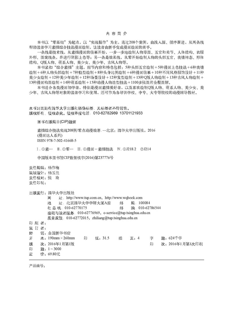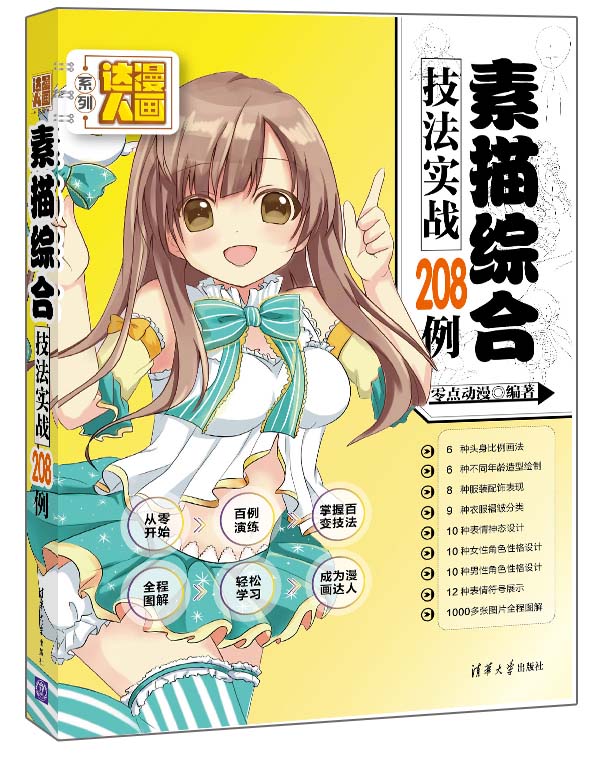 本书以“零基础”为起点,以“实战操作”为主,通过208个案例,由浅入深、循序渐进,从两条线帮助读者学习素描综合技法漫画绘制,让读者由新手变成漫画绘画的高手。 一条线是技术线,从素描漫画的临摹开始,一步一步地绘制人物草图、五官和关节、人体结构、衣服外形、图案线条,并进行阴影上色等;另一条是效果线,从零开始绘制人物的头部五官、表情神态、形体结构、Q版人物、萌系人物、美少女、美少年、古风人物等。 本书紧扣“综合素描”主题,细节内容和特色包括:5种头部五官绘制+5种漫画上色技法+6种表情绘制+6种人物头部绘制+7种脸型绘制+8种头身比例绘制+6种漫画临摹+10种不同风格服饰设计+11种美少女绘制+12种美少年绘制+12种场景设计+12种发型绘制+13种Q版人物绘制+13种古风人物绘制+13种漫画构图绘制+14种萌系绘制+15种动漫人物造型技法+1100多张图片全程图解。 本书适合各类漫画初学者,特别是漫画素描爱好者,以及喜欢绘制Q版人物、萌系人物、美少女、美少年、古风人物等对象的读者学习和使用,还可作为各培训学校、中专、大专等院校的动漫辅导教材。
