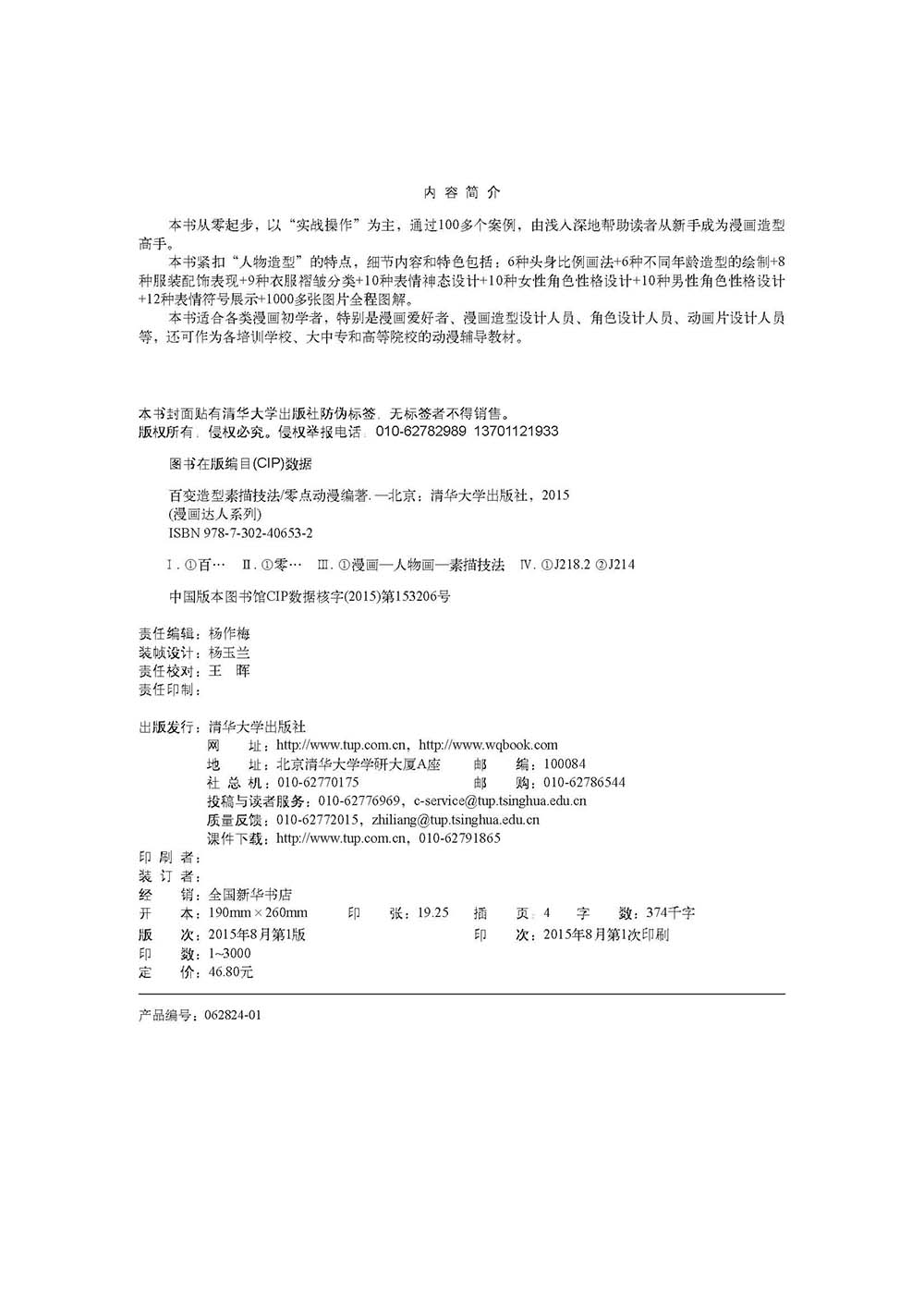 本书从零起步,以“实战操作”为主,通过100多个案例,由浅入深地帮助读者从新手成为漫画造型高手。 本书紧扣“人物造型”的特点,细节内容和特色包括:6种头身比例画法+6种不同年龄造型的绘制+8种服装配饰表现+9种衣服褶皱分类+10种表情神态设计+10种女性角色性格设计+10种男性角色性格设计+12种表情符号展示+1000多张图片全程图解。 本书适合各类漫画初学者,特别是漫画爱好者、漫画造型设计人员、角色设计人员、动画片设计人员等,还可作为各培训学校、大中专和高等院校的动漫辅导教材。