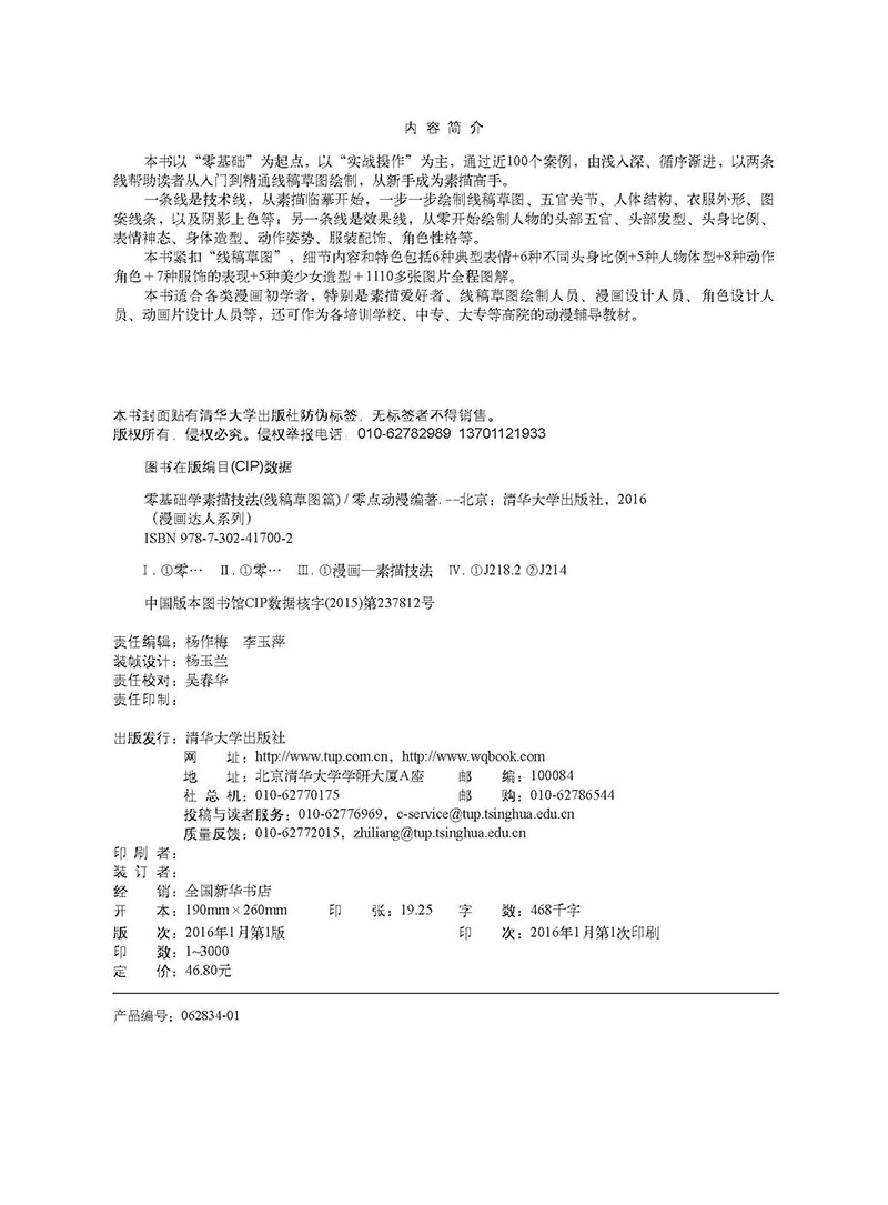 本书以“零基础”为起点,以“实战操作”为主,通过近100个案例,由浅入深、循序渐进,以两条线帮助读者从入门到精通线稿草图绘制,从新手成为素描高手。 一条线是技术线,从素描临摹开始,一步一步绘制线稿草图、五官关节、人体结构、衣服外形、图案线条,以及阴影上色等;另一条线是效果线,从零开始绘制人物的头部五官、头部发型、头身比例、表情神态、身体造型、动作姿势、服装配饰、角色性格等。 本书紧扣“线稿草图”,细节内容和特色包括6种典型表情+6种不同头身比例+5种人物体型+8种动作角色+7种服饰的表现+5种美少女造型+1110多张图片全程图解。 本书适合各类漫画初学者,特别是素描爱好者、线稿草图绘制人员、漫画设计人员、角色设计人员、动画片设计人员等,还可作为各培训学校、中专、大专等高院的动漫辅导教材。