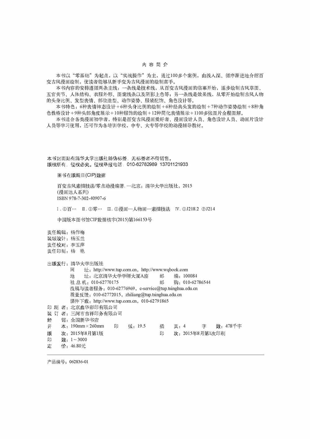 本书以“零基础”为起点,以“实战操作”为主,通过100多个案例,由浅入深、循序渐进地介绍百变古风漫画绘制,使读者能够从新手变为古风漫画的绘制高手。 本书内容的安排遵循两条主线:一条线是技术线,从百变古风漫画的临摹开始,逐步绘制古风草图、五官关节、人体结构、衣服外形、图案线条以及阴影上色等;另一条线是效果线,从零开始绘制古风人物的头身比例、发型表情、部位造型、动作姿势、服装配饰、角色设计等。 本书特色:6种表情神态设计+6种头身比例的绘制+6种经典头发的绘制+7种动作姿势绘制+8种角色性格设计+9种头部角度展示+10种服饰的绘制+12种简化表情展示+1100多张图片全程图解。 本书适合各类漫画初学者,特别是百变古风漫画爱好者、漫画设计人员、角色设计人员、动画片设计人员等学习使用,还可作为各培训学校,中专、大专等学校的动漫辅导教材。