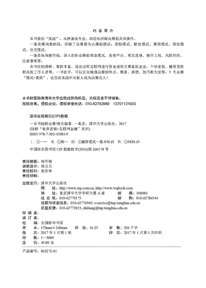 本书紧扣“实战”,从两条线专业、深层地讲解众筹的具体操作。 一条是横向案例线,讲解了众筹最为火爆的模式:奖励模式、股权模式、募捐模式、债权模式、社交模式。 一条是纵向操作线,深入剖析众筹的商业模式、各类平台、项目选择、操作上线、风险把控、注意事项等。 本书结构清晰,案例丰富,适合运用互联网进行资金或项目筹备的企业、个体老板、融资贷款相关的工作人员等。一书在手,可以完全精通众筹的特点、要素、类型、技巧和方法等;5大众筹“模式+案例”,让您在实战中从新人成为众筹达人!