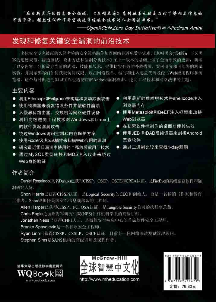 Daniel Regalado(又名Danux)已获得CISSP、OSCP、OSCE和CREA认证,是FireEye的高级恶意软件和漏洞研究人员。Shon Harris已获得CISSP认证,是Logical Security的CEO和创始人,也是一名畅销书作家和教育工作者。Shon曾担任美国空军信息战部队的工程师。Allen Harper已获得CISSP、PCI QSA认证,是Tangible Security公司的执行副总裁。Chris Eagle是加州海军研究生院(NPS)计算机科学系的高级讲师。Jonathan Ness已获得CHFI认证,是微软安全响应中心的首席软件安全工程师。Branko Spasojevic是一名谷歌安全工程师。Ryan Linn已获得CISSP、CSSLP、OSCE认证,目前是一位网络渗透测试管理顾问。Stephen Sims是SANS机构的高级讲师及课程作者。