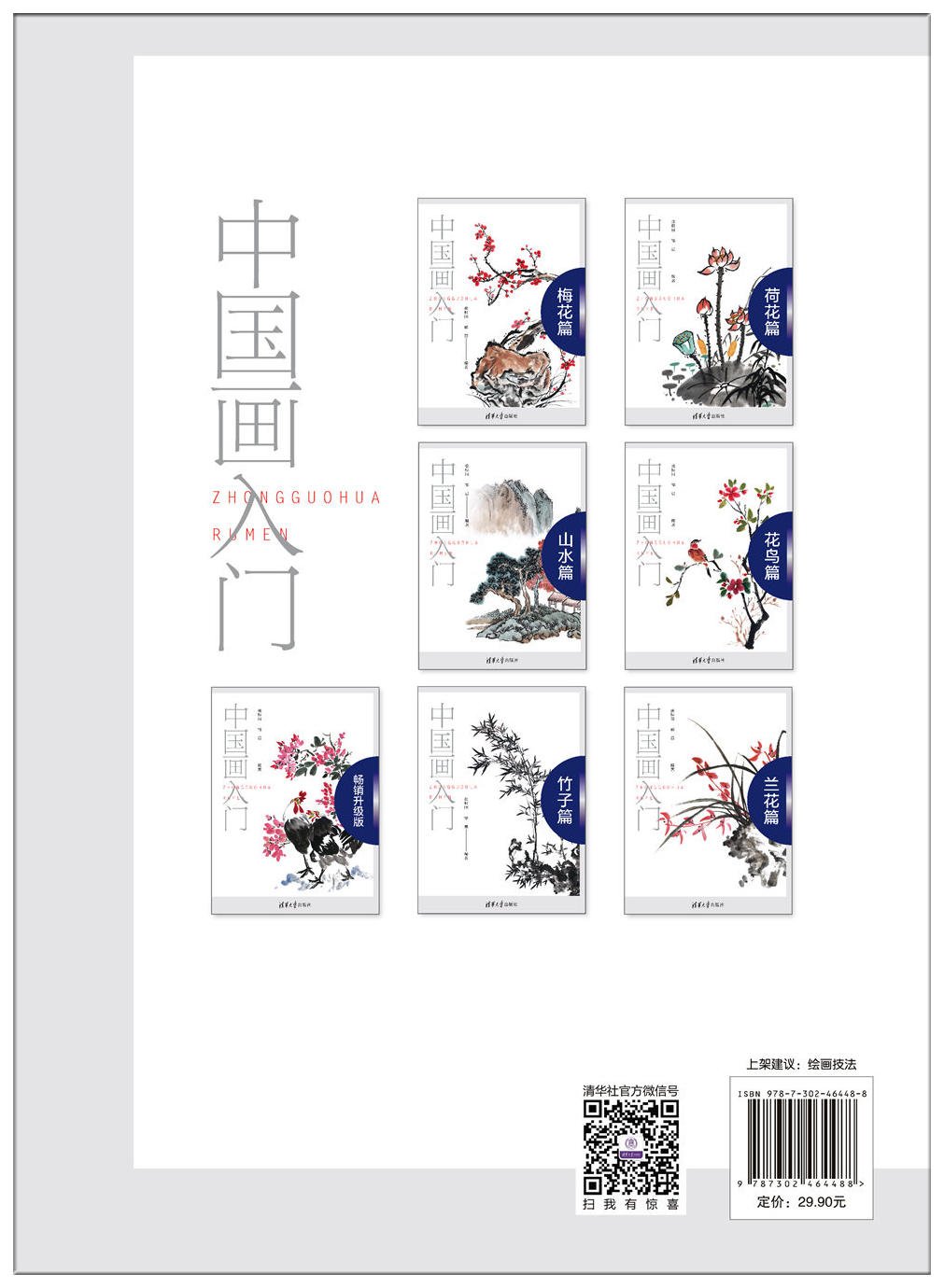 中国画艺术历史悠久,源远流长,经过数千年的不断丰富、革新和发展,创造了具有鲜明民族风格和丰富多彩的形式手法,形成了独具中国意味的绘画语言体系,是几千年来中国文化传统的具体体现,在世界美术领域中自成体系,是东方绘画系的重要组成部分。 《中国画入门》是一套学习中国画的入门教材,该套书共7个分册,分别是国画基础篇、兰花篇、竹子篇、花鸟篇、山水篇、梅花篇、荷花篇。该套图书既可独立成册,又可成为一个体系,每个分册对不同的表现对象进行了详细的讲述,始终把基础和实用放在第一位,非常适合中国画爱好者和初学者临习之用。 本套图书以中国画具体的实践练习为主线,通过大量典型的作品范例,详细地介绍了中国画的表现方法和绘画步骤,总结了学习中国画的入门知识、基础技法和典型范例。本丛书内容简明易学,通俗易懂,书中的大量范本讲解清楚、透彻,便于临摹,可以使初学者看得懂、学得会、掌握牢、见效快,是引领绘画爱好者学习中国画艺术的捷径。非常适合广大初、中级国画初学者和爱好者自学入门,同时也可以作为美术培训机构、高职院校和老年大学相关专业的教材。 《中国画入门》由张恒国和邹晨担任主编,参编人员还有陈鑫、晁清、李素珍、魏欣、李松林、杨超、李宏文、张丽、黄硕、卜东东、焦静等人。 由于时间紧、作者水平有限,本书难免存在不足之处,需要在实践中不断改进、不断完善,望广大读者指正。
