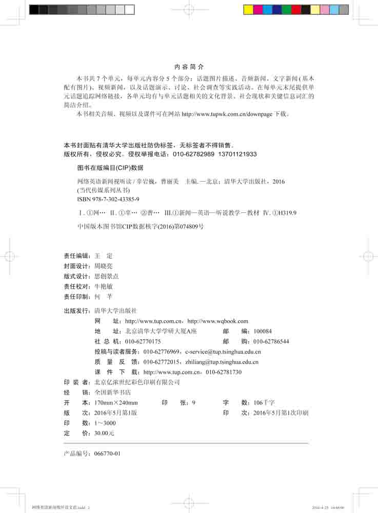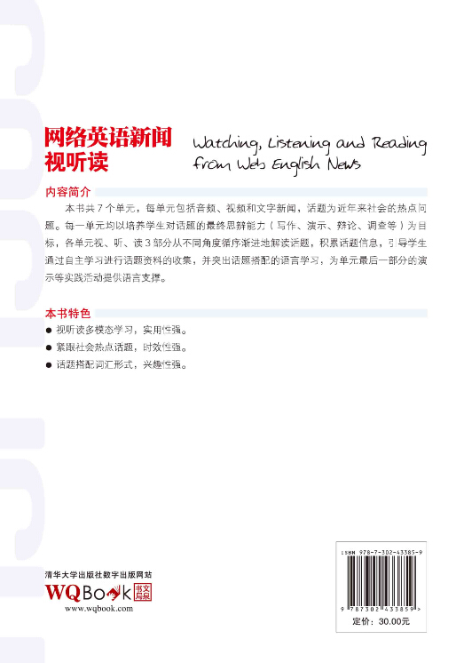 本书共7个单元,每单元内容分5个部分:话题图片描述、音频新闻、文字新闻(基本配有图片)、视频新闻,以及话题演示、讨论、社会调查等实践活动。在每单元末尾提供单元话题追踪网络链接,各单元均有与单元话题相关的文化背景、社会现状和关键信息词汇的简洁介绍。 本书相关音频、视频以及课件可在网站http://www.tupwk.com.cn/downpage下载。