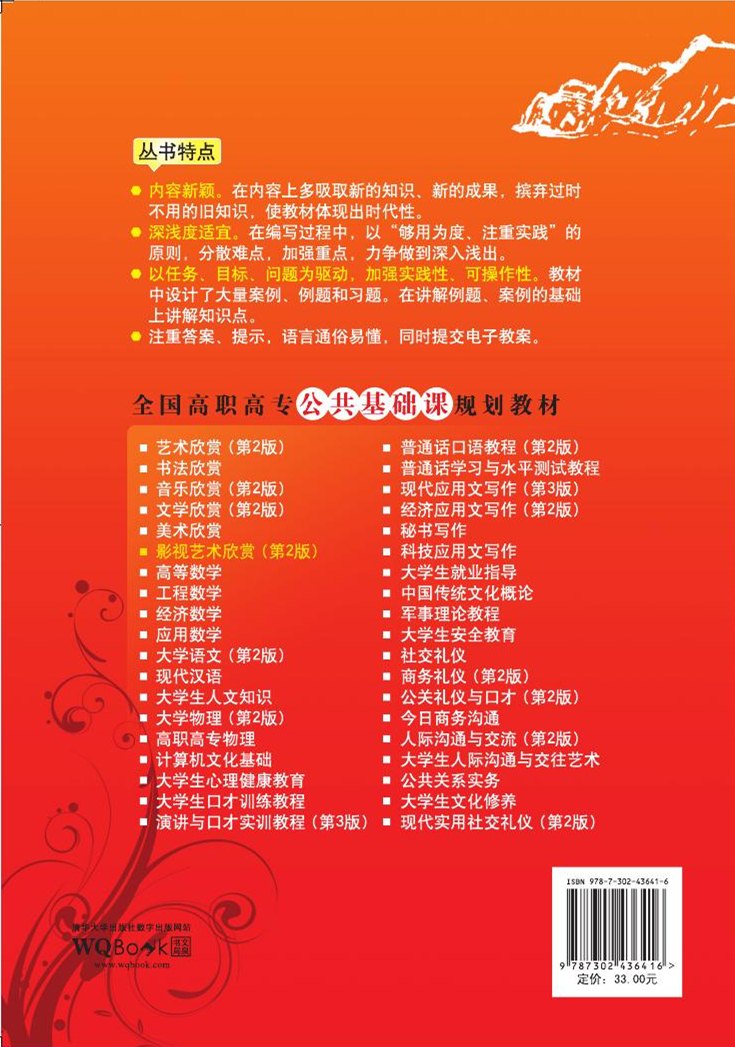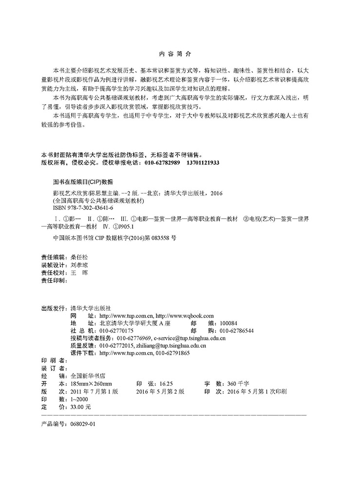 本书主要介绍影视艺术发展历史、基本常识和鉴赏方式等,将知识性、趣味性、鉴赏性相结合,以大量影视片段或影视作品为例进行讲解,融影视艺术理论和鉴赏内容于一体,以介绍影视艺术常识和提高欣赏能力为主线,有助于提高学生的学习兴趣以及加深学生对知识点的理解。 本书为高职高专公共基础课规划教材,考虑到广大高职高专学生的实际情况,行文力求深入浅出,明了易懂,引导读者步步深入影视欣赏领域,掌握影视欣赏技巧。 本书适用于高职高专学生,也适用于中专学生,对于大中专教师以及对影视艺术欣赏感兴趣人士也有较强的参考价值。