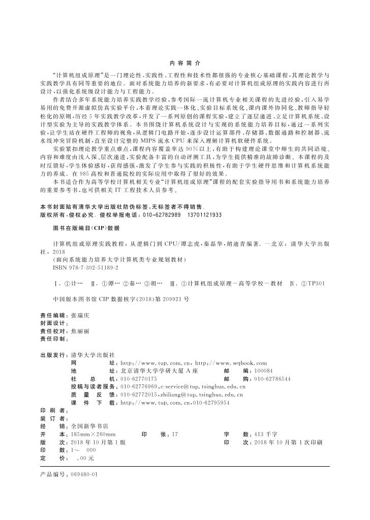 前言“计算机组成原理”作为计算机专业核心基础课,主要讨论计算机各大功能部件的基本组成原理及其互连构成整机的技术,在计算机系统能力培养目标中起着重要的承上启下作用,其先导课程包括“数字逻辑”和“汇编语言程序设计”,后续课程为“计算机系统结构”和“计算机接口技术”。该课程的实践教学应该站在贯穿计算机硬件系列课程的角度,引导学生如何利用前导课程的基本知识,设计计算机主要功能部件并构成整机系统。与理论课程配合,实现计算机系统设计能力的培养 。 “计算机组成原理”课程理论综合性强,课程实验尤其是综合实验难度大,存在时间、场所、平台等诸多制约因素,为了从根本上解决实践教学中的困难,作者结合多年的教学经验,进行了一系列卓有成效的实践教学改革。参考国际一流计算机专业相关课程的先进经验,引入了易学易用的开源虚拟仿真实验平台,本着理论实践一体化、实验目标系统化、实验平台虚拟化、教师指导轻松化的原则,历经5年持续的实践教学改革,开发并完善了一系列内容丰富的课程实验,建立了逐层递进、立足计算机系统、设计型实验为主导的实践教学体系。本教材就是相关实践教学改革的主要成果,其主要特点如下。 (1) 理论实践一体化: 相关实验紧扣理论教学重点、难点,课程内容覆盖率达90%以上,有助于构建理论课堂中师生的共同语境,为翻转课堂提供丰富的教学素材,实验内容大多处于布鲁姆认知分类法中的运用、分析、综合、评价4个层次,学生完成系列实验,对相关知识的掌握更透彻,为理论教学提供强力的支撑。 (2) 实验目标系统化: 围绕计算机系统设计与实现的系统能力培养目标,让学生站在硬件工程师的视角,从逻辑门电路开始,逐步设计运算...