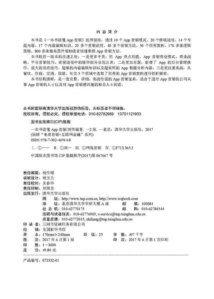 本书是《一本书读懂App营销》的升级版,通过10个App营销模式、20个挣钱途径、14个专题内容、17个内容编辑知识、20多个营销诀窍、40多个营销方法、50个优秀案例、170多张逻辑图解、800多张精美图片帮助读者快速掌握App营销方法。 本书较前一版本的改进之处:一是更多干货,把App热点功能、App营销商业模式、商业战略、平台营销技巧、营销途径中的精华部分呈现出来;二是更加全面,新增了App的后台管理操作、强大的引流技巧、超棒的内容编辑知识以及超实用的App数据分析内容;三是更注重实战,从餐饮、住宿、交通、服装、社交5个领域中选取了优秀的App营销案例进行剖析解密。 本书结构清晰,是一套完整、详细、实战性强的App营销宝典,适合于进行App营销的公司从事App营销的人士以及对App营销感兴趣的相关人士阅读。