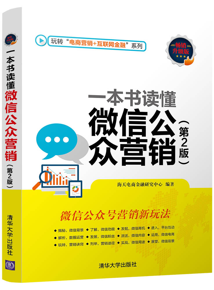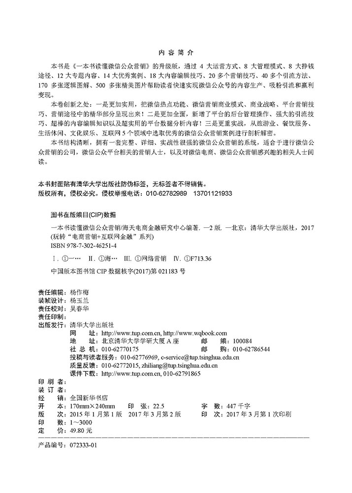 前 言 市场上针对微信公众营销的书籍较多,但是内容上大多创新不够,或者不够全面,本书是《一本书读懂微信公众营销》的升级版,相比前一版,本书在后台管理操作、引流、内容编辑、平台数据分析营销工具及行业案例方面更为突出,尤其是书中关于微信公众营销的实用技巧,是笔者潜心收集并整合最新资料提炼出来的。 本书的核心是帮助企业或个人通过微信公众营销方式,推广企业产品、树立良好的企业品牌、最终实现赢利。本书内容图解如下。 本书由海天电商金融研究中心编著,参与编写的具体人员有贺琴、刘胜璋、刘向东、刘松异、刘伟、卢博、周旭阳、袁淑敏、谭中阳、杨端阳、李四华、王力建、柏承能、刘桂花、柏松、谭贤、谭俊杰、徐茜、刘嫔、苏高、柏慧等人,在此一并表示感谢。由于作者知识水平有限,书中难免有错误和疏漏之处,恳请广大读者批评指正。 编 者