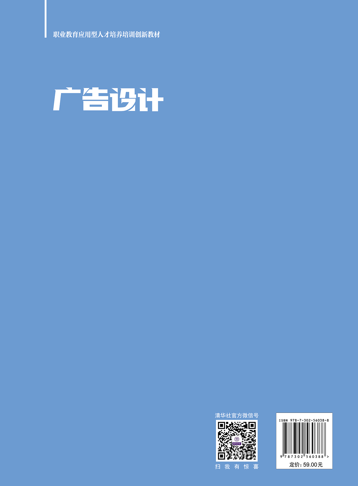 “广告设计”是职业院校广告艺术设计专业非常重要的核心课程,也是广告公司的主营业务。本书注重广告设计理 论教学与应用实践的紧密结合,以大量国内外优秀广告设计作品和学生实践项目为范例,特别引入了含有中国传统优秀 文化元素的设计范例,对培养学生的职业素养和人文情怀,加强学生的文化自信有很大帮助。本书具体介绍了图形创意 及其方法、构成元素、色彩元素、标志设计、字体设计与运用和广告设计的规律等基本知识,诠释了广告设计的视觉传 达要素——图形、文字、色彩、编排,在广告设计应用与赏析部分还分类探讨了公益广告、学生竞赛作品、公司宣传广 告等优秀案例。在课后的体验与实践中,本书根据职业院校学生的基础水平和课时安排,编写了难易适当的作业。通过 完成这些作业,读者可以将书本知识与个人的思考和艺术实践结合起来,有效地掌握广告设计的方法。