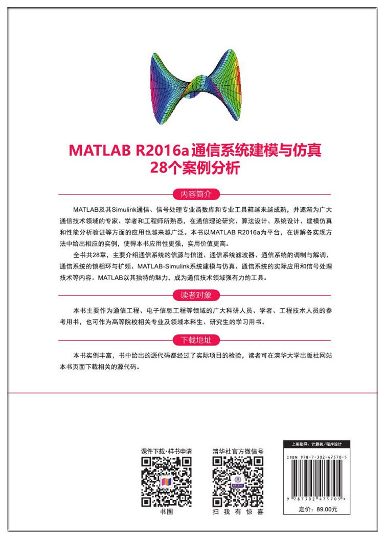 前言 MATLAB是当今最优秀的科技应用软件之一,它以强大的科学计算与可视化功能、简单易用的特点、开放式可扩展环境,特别是所附带的30多种面向不同领域的工具箱支持,使得它在许多科学领域成为计算机辅助设计与分析、算法研究与应用开发的基本工具和首选平台。它具有其他高级语言难以比拟的一些优点,如编写简单、编程效率高、易学易懂等,因此MATLAB语言也被通俗地称为演算纸式科学算法语言。在通信、信号处理、控制及科学计算等领域,MATLAB应用广泛,已经成为可有效提高工作效率、改善设计手段的工具软件。掌握了MATLAB,就好比掌握了开启这些专业领域大门的钥匙。 Simulink是MATLAB的一个工具包,其建模与一般程序建模相比更为直观,操作也更为简单,不必记忆各种参数——命令的用法,只要用鼠标就能够完成非常复杂的工作。Simulink不但支持线性系统仿真,还支持非线性系统仿真; 不仅支持连续系统仿真,还支持离散系统甚至混合系统仿真; 不仅本身功能非常强大,而且还是一个开放性体系,用户可以自己开发模块来增强Simulink的功能。对于同一个系统模型,利用Simulink可以采用多个不同的采样速率,不但能够实时地显示计算结果,还能够显示模型所表示实物的实际运动形式。 目前,通信技术领域是一个非常热门的领域,无论是有线通信技术还是无线通信技术,都已应用到人们生活的各个方面,通信系统正向着宽带化方向迅速发展。使用MATLABSimulink进行通信系统建模与仿真设计,已经成为广大通信工程师必须研究、掌握的技术之一。 为了满足通信技术发展的需要,结合MATLAB的功能特点,作...