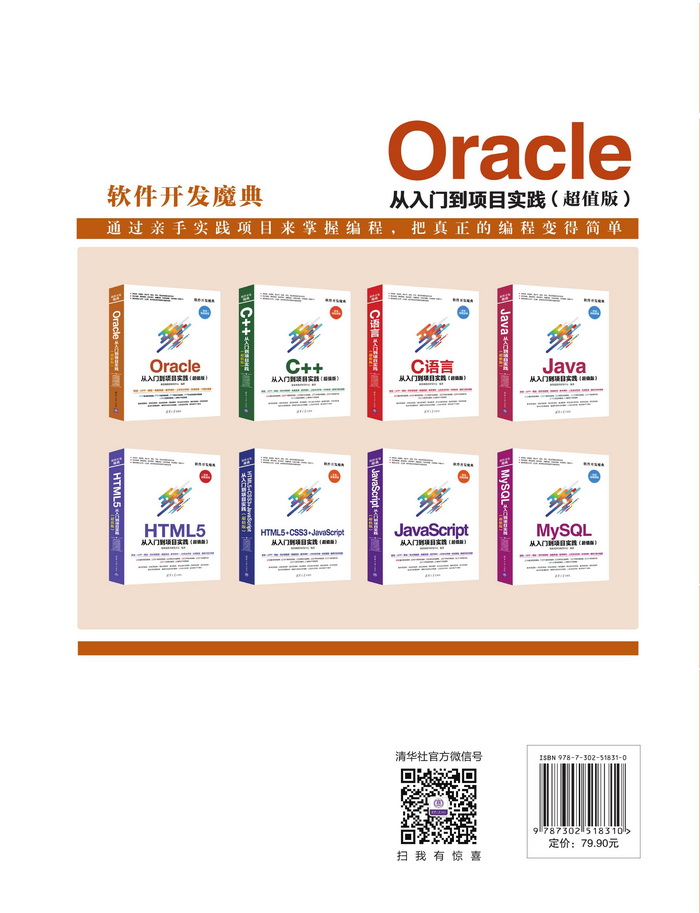 丛书说明 本套“软件开发魔典”系列图书,是专门为编程初学者量身打造的编程基础学习与项目实践用书。 本丛书针对“零基础”和“入门”级读者,通过案例引导读者深入技能学习和项目实践。为满足初学者在基础入门、扩展学习、编程技能、行业应用、项目实践5个方面的职业技能需求,特意采用“基础知识→核心应用→核心技术→高级应用→行业应用→项目实践”的结构和“由浅入深,由深到精”的学习模式进行讲解。 本丛书目前计划有以下分册: 《Java从入门到项目实践(超值版)》 《HTML 5从入门到项目实践(超值版)》 《C语言从入门到项目实践(超值版)》 《MySQL从入门到项目实践(超值版)》 《JavaScript从入门到项目实践(超值版)》 《C++从入门到项目实践(超值版)》 《Oracle从入门到项目实践(超值版)》 《HTML 5+CSS 3+JavaScript从入门到项目实践(超值版)》 古人云:读万卷书,不如行万里路;行万里路,不如阅人无数;阅人无数,不如有高人指路。这句话道出了引导与实践对于学习知识的重要性。本丛书始于基础,结合理论知识的讲解,从项目开发基础入手,逐步引导读者进行项目开发实践,深入浅出地讲解Oracle数据库在软件编程的各项技术和项目实践技能。本丛书的目的是多角度、全方位地帮助读者快速掌握软件开发技能,构建从高校到社会的就职桥梁,让有志从事软件开发的读者轻松步入职场。 Oracle数据库最佳学习线路 本书以Oracle最佳的学习模式来分配内容结构,第1~4篇可使读者掌握Oracle数据库基础知识和应用技能,第5篇可使读者拥有多个行业项目开发经...
