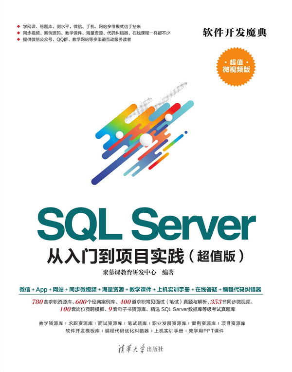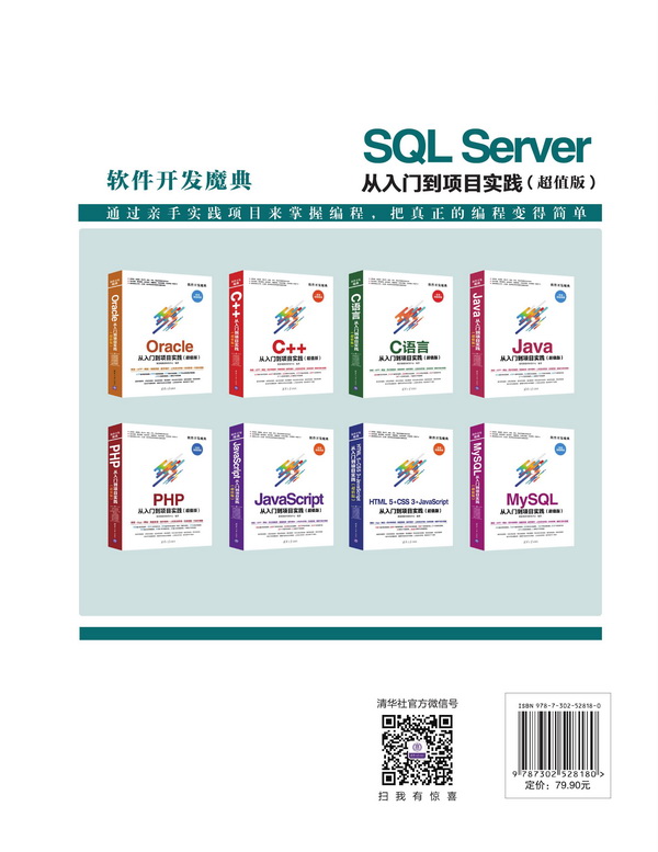 《SQL Server 从入门到项目实践(超值版)》采取“基础知识→核心技术→核心应用→高级应用→项目实践”的结构和“由浅入深,由深到精”的学习模式进行讲解。《SQL Server 从入门到项目实践(超值版)》共分为5篇20章。首先讲解数据库的基础知识,数据库的安装、配置与管理,SQL的基本操作,创建与管理数据库及数据表,表的约束条件以及SQL数据的查询操作等;然后侧重讲解了视图、游标、存储过程、索引、触发器、事务与锁的应用等;最后又介绍了SQL Server数据库的安全管理、数据库的备份与还原等;最后在实践环节讲解了外卖订餐管理系统、企业工资管理系统两个项目实践案例。 《SQL Server 从入门到项目实践(超值版)》旨在从多角度、全方位地帮助读者快速掌握软件开发技能,构建从学校到社会的就业桥梁,让有志于从事软件开发行业的读者轻松步入职场。同时《SQL Server 从入门到项目实践(超值版)》还赠送**资源库,由于赠送的资源比较多,在本书前言部分对资源包的具体内容、获取方式以及使用方法等做了详细说明。