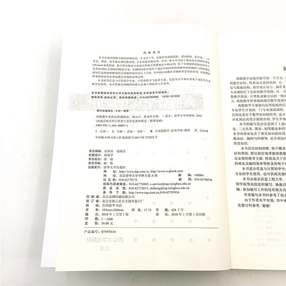 本书介绍离散数学的知识和应用。全书共7 章, 分别介绍命题逻辑、谓词逻辑、集合论、二元 关系、图论、初等数论和代数系统, 并介绍相关的应用。其中, 第6 章讨论了数论在公钥密码系统 ElGamal 加密解密、数字签名解决方案和计算机大整数加法中的应用; 第7 章利用群的知识给出了 著名的RSA 公钥密码解决方案, 在域的内容中给出了通信中的线性码和循环码的编码与纠错理论, 还对信息的加密解密算法和编码效率进行了讨论。书中的应用都有详细的背景知识介绍, 应用理论 涉及的结论和定理也都有详细的证明过程。 本书适合信息与计算科学专业、计算机科学与技术专业、信息安全专业以及电子通信等专业 的学生使用,也可供相关领域的科研人员和工程技术人员参考。
