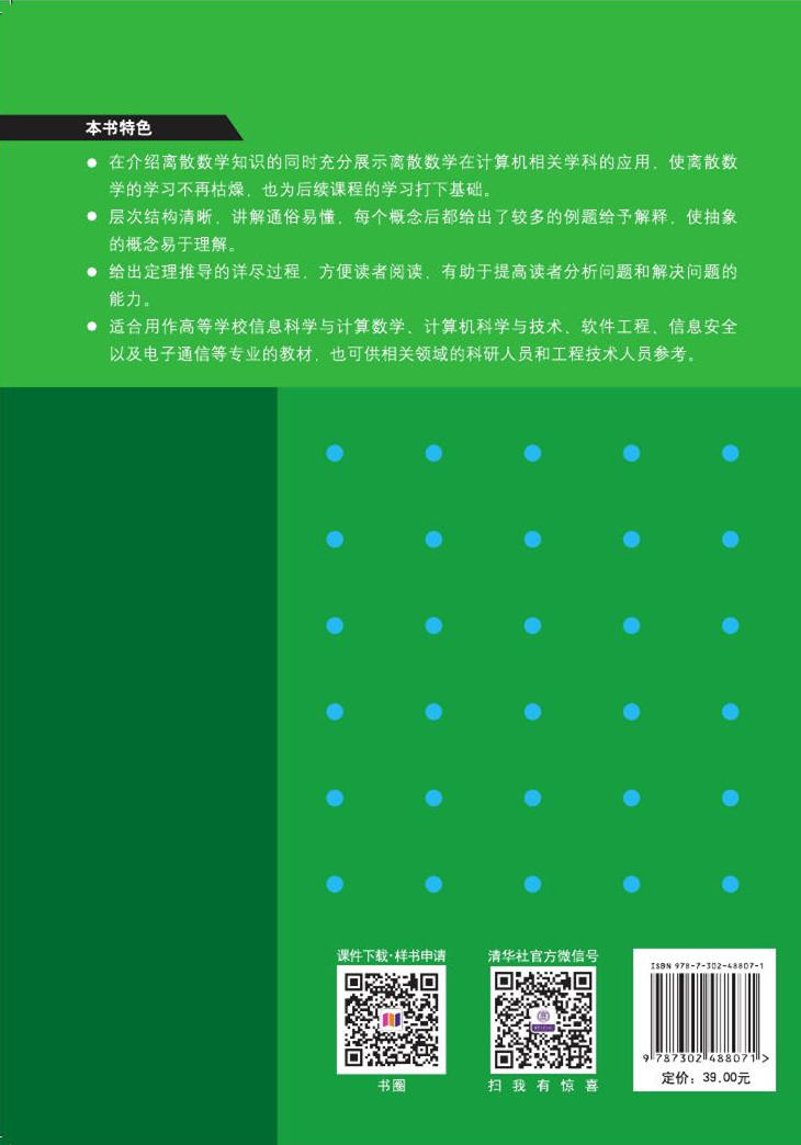 本书最鲜明的特色是在介绍离散数学知识的同时充分展示离散数学在计算机相关学科的应用,使离散数学的学习不再枯燥,也为后续课程的学习打下基础。层次结构清晰,讲解通俗易懂,每个概念后都给出了较多的例题给予解释,这对理解一些抽象的概念有很好的帮助。在定理的推导方面,特别是关于应用中定理的推导,都给出了详尽的证明过程,方便读者阅读,也有助于提高读者的分析问题和解决问题的能力。适合用作高等学校信息科学与计算数学、计算机科学与技术、软件工程、信息安全以及电子通信等专业的教材,也可供相关领域的科研人员和工程技术人员参考。