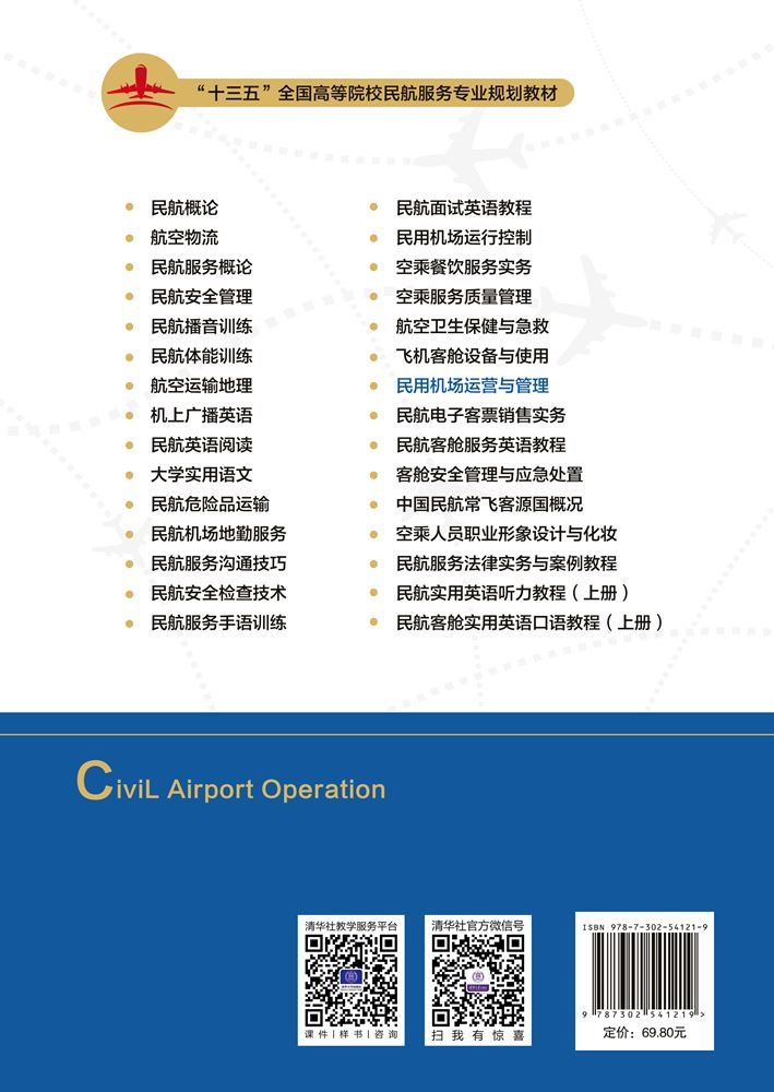民用机场运营与管理在写作的过程中参考了大量的专著、教材和资料,尤其阅读了中国民航报大量的新闻报道,这些作者前期进行的探索和研究为本书的编写奠定了坚实基础。习,并在最后附录中提供大量教学参资料,是高等院校航空服务、航空经营管理、航空商务、物流管理等相关专业师生及民航运输管理人员在学习、教学、参考、阅读时的必备材料,也可以作为民航企业、物流企业培训教材之用。