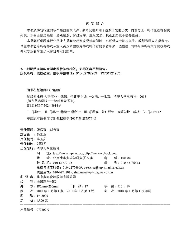 《游戏专业概论(第3版)》从游戏行业的各个层面由浅入深、多角度地介绍了游戏开发的历史、内部分工、制作流程等相关知识。本书由游戏概述、游戏策划、游戏程序、游戏艺术、职业之路五个部分组成。 《游戏专业概论(第3版)》既可供游戏行业从业人员和游戏开发爱好者阅读,也可供大专院校学生、教师和研究人员参考。希望本书能给所有游戏从业人员及希望成为游戏制作者的读者带来一些借鉴,同时帮助所有大专院校游戏开发专业的学生步入游戏开发的殿堂。