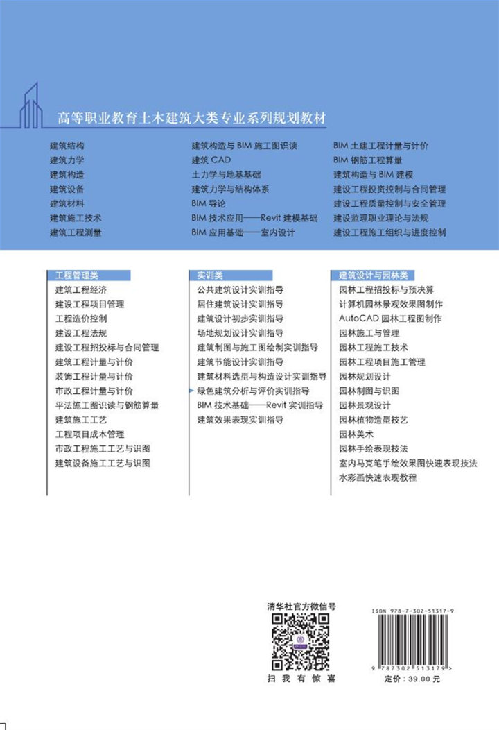 前言 当前,绿色建筑是整个建筑行业的一个趋势,绿色建筑设计是现代化建筑设计的一个主方向,越来越受到人们的关注和青睐。近年来,随着国家大力推行绿色建筑设计及评价,建筑设计市场出现了新的就业岗位——绿色建筑工程师。 为方便进行相应的学生实训锻炼和教师教学活动,针对本课程的实践性、系统性和该课程在专业中的重要性,以及绿色建筑工程师岗位所提出的工作要求,我们特意编写了本书。本书在编写上力求做到符合高职高专建筑设计专业的教学特点以及课程教学改革的要求,根据现行的《绿色建筑评价标准》(GB/T 50378—2014)编制实训任务,并明确各任务的教学目标,着重培养学生的实操技能和职业能力,全面提高学生学习的主动性、能动性和综合素质。本书从实践性教学环节着手,构建了20个实训任务驱动的4个模块式课程结构,其中,模块1为“节地与室外环境”,含7个实训任务; 模块2为“节能与能源利用”,含3个实训任务; 模块3为“节材与材料资源利用”,含4个实训任务; 模块4为“室内环境质量”,含6个实训任务。 本书为校企合作共同编写,由湖南城建职业技术学院尹巧玲、刘岚任主编,刘思思、刘娟任副主编,杨卉、彭瑶、邹宇参编,本书编写分工为: 模块1由尹巧玲编写,模块2由刘娟编写,模块3由刘思思、刘岚编写,模块4由尹巧玲、刘思思编写。 本书得到了湖南宝信云建筑综合服务平台股份有限公司的指导与支持,在此表示衷心的感谢! 本书在编写过程中参考了有关标准、书籍、图片及其他文献资料,得到了编者所在单位的领导和同事以及出版社的鼎力支持,在此一并致谢。由于编者水平有限,书中不足之处在所难免,恳请各位读者批评、指正...