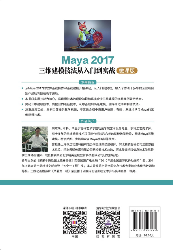 (1)从Maya 2017的软件基础操作和基础建模开始讲起,从入门到实战,融入了作者十多年的企业项目制作经验和院校教学经验。(2)本书以实用技能为核心,将建模技术的理论知识和真实企业三维建模的实践案例紧密结合。(3)揭秘三维建模技术,传授业内建模技术,从零基础到高级建模,循序渐进讲解制作技法。(4)注重应用实战,案例全部提供视频化教学,非常适合初、中级用户快速、有效、系统地学习Maya的三维建模技术。