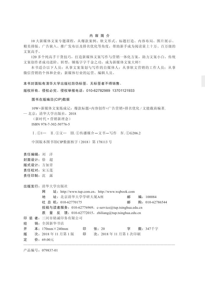 10大新媒体文案专题课程,从爆款案例、软文形式、标题打造、内容布局、图片展示、精美排版、广告嵌入、推广发布以及排名优化等角度,帮助新手成为阅读量上十万、百万级的文案高手。 120多个纯高手干货技巧,打造新媒体文案写作与营销一体化方案,助力文案小白、传统文案创作者成功进阶、转型,打造字字千金,成为新媒体文案大师! 本书适合以下人员:从事文案策划与写作的自媒体人;从事软文营销的工作人员;从事微信营销的个体和企业;新媒体行业的运营、编辑人员。
