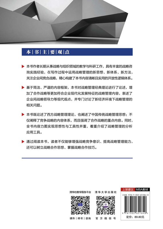 本书共分为六篇,具体为:战略管理基础、战略分析、战略设计、战略选择、战略实施和战略评估。基于简洁、严谨的内容框架,本书对战略管理经典理论进行了论述,增加了合作战略等更加符合企业现代化发展特征的战略管理内容,表述了企业间战略领导力等现代观点,并专门讨论了新经济环境下战略管理的相关问题。 本书既论述了西方战略管理理论,也阐述了中国传统战略管理思想;不仅阐释了竞争战略的内容体系,而且强调了合作战略的重点内容。同时,全书内容力图实现思想性与工具性并重,着重介绍了战略管理的分析应用工具,并且专门论述了合作战略选择的分析工具。 通过阅读本书,读者不仅能够增强战略竞争意识、提高战略管理能力,还可以树立战略合作思想、掌握战略合作技巧。本书构建了竞争与合作并重的战略管理结构体系,适合中国战略管理教学与实践的发展特点,是体系新颖、结构严谨的战略管理教科书,可以作为各类组织管理人员制定战略的指导手册。
