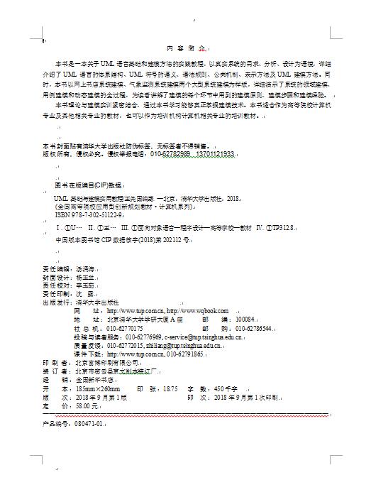 前 言 “UML 基础与建模实用教程”是计算机科学与技术专业及其相关专业的必修课程,也是系统分析师、架构师、设计师的核心课程。因此,选择一本好的UML语言教程,对计算机专业的学生来说是非常必要的。 尽管市面上介绍 UML 语言及建模方法的图书不少,但是基本都存在两点不足。 (1) 书中介绍的有关建模过程和方法都是从需求分析制品或者设计制品中截取的某个建模片段,学生无法理解这些孤立抽取的建模片段,也无法真正理解建模原理、建模过程和建模方法。 (2) 在市面上出版的 UML 语言及建模教材中,没有一本书在系统分析、设计过程中全面涵盖领域建模、用例建模、动态建模的内容,这就导致了 UML 语言学习与实际建模过程相脱节,学生无法真正理解建模原则和建模方法,因此更谈不上在实际建模过程中正确运用面向对象技术、建模原则、建模策略和方法了。 本书不仅克服了以上两个缺点,而且还将面向对象的分析技术、设计技术与建模过程和方法有机地结合在一起,并通过网上书店建模、气象监测系统建模,揭示了建模原则、建模方法的内在本质。读者通过对本书两个系统建模过程的学习,一定可以真正掌握建模方法的精髓。 本书特色 本书体系结构严密,内容组织风格统一,知识表达通俗易懂,知识讲解深入浅出,具体特点如下。 (1) 体系结构鲜明。强调知识的系统性、连贯性、逻辑性,对 UML 符号的语义、语法和表示方法的介绍由易到难逐层展开,与人类思维特点一致。 (2) 内容组织风格统一。对UML符号的语义、语法讲解上采用统一的格式,即从抽象到具体,从简单到复杂;采用文字描述和图形描述相结合,通过文字描述,详细地定义了...