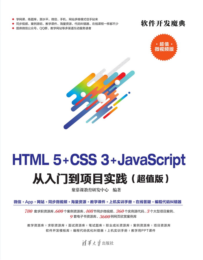 《HTML 5+CSS 3+JavaScript从入门到项目实践:超值版》采用“基础知识→核心应用→核心技术→高级应用→行业应用→项目实践”的结构和“由浅入深,由深到精”的模式进行讲解。 全书共分6篇31章。首先讲解了HTML 5、CSS 3、文本、列表、页面布局等Web前端开发的语言基础知识,然后深入介绍了JavaScript语言基础、开发应用、对象与数组、函数与闭包以及人机交互等核心运用。在实践环节不仅讲述了Web前端开发在金融理财、移动互联网、电子商务等行业的应用,还介绍了其在企业门户网站、游戏大厅网站以及App等大型项目中的应用,全面展现了项目开发实践的全过程。 《HTML 5+CSS 3+JavaScript从入门到项目实践:超值版》的目的是多角度、全方位地帮助读者快速掌握软件开发技能,构建从高校到社会的就职桥梁,让有志于从事软件开发工作的读者轻松步入职场。本书赠送的资源比较多,在本书前言部分对资源包的具体内容、获取方式以及使用方法等做了详细说明。