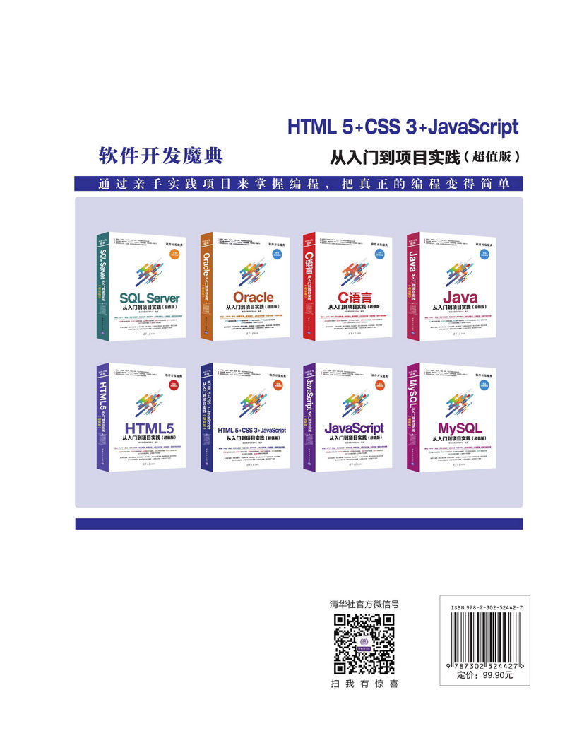 丛书说明 本套“软件开发魔典”系列图书,是专门为编程初学者量身打造的编程基础学习与项目实践用书。 本丛书针对“零基础”和“入门”级读者,通过案例引导读者深入技能学习和项目实践。为满足初学者在基础入门、扩展学习、编程技能、行业应用、项目实践5个方面的职业技能需求,特意采用“基础知识→核心应用→核心技术→高级应用→行业应用→项目实践”的结构和“由浅入深,由深到精”的模式进行讲解。 本套丛书目前计划有以下书目。 《Java从入门到项目实践(超值版)》 《HTML 5从入门到项目实践(超值版)》 《C语言从入门到项目实践(超值版)》 《MySQL从入门到项目实践(超值版)》 《JavaScript从入门到项目实践(超值版)》 《Oracle从入门到项目实践(超值版)》 《C++从入门到项目实践(超值版)》 《HTML 5+CSS 3+JavaScript从入门到项目实践(超值版)》 古人云,读万卷书,不如行万里路;行万里路,不如阅人无数;阅人无数,不如有高人指路。这句话道出了引导与实践对于学习知识的重要性。本书始于基础,结合理论知识的讲解,从项目开发基础入手,逐步引导读者进行项目开发实践,深入浅出地讲解Web前端编程的各项技术和项目实践技能。我们的目的是多角度、全方位地帮助读者快速掌握软件开发技能,为读者构建从高校到社会的就职桥梁,让有志从事软件开发的读者轻松步入职场。 Web前端开发最佳学习线路 本书以Web前端开发最佳的学习模式设置内容结构,第1~4篇可使您掌握Web前端编程基础知识、应用技能,第5、6篇可使您拥有多个行业项目开发经验。遇到问题可学习本书同步...