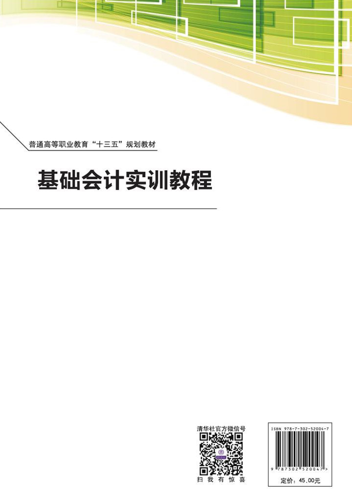 前言 “基础会计实训”是会计及相关专业的专业基础实训课程,在会计系列课程中占有重要地位。加强基础会计的实训,提高学生的基础操作能力是高职院校会计专业学生的培养目标之一。特别是企业会计准则的不断更新,会计手段的逐渐升级,企业的业务也随之发生了较大的变化,传统的会计模拟实训教程已难以满足高职高专学生的学习需求。为强化学生的基础技能,解决基础会计模拟实训与实践脱节的弊端,经过大量实践,总结以往的经验,基于最新版《企业会计准则》,我们组织编写了本书,意在夯实学生的基础技能,扎实学生的操作技能,更好地理解会计的核算方法,为今后专业课程的学习奠定坚实的理论基础和实践基础。 本书的主要特色如下。 一是实用性。本书主要介绍了原始凭证的填制审核、记账凭证的填制与审核、科目汇总表的编制、日记账的登记、银行存款余额调节表的编制、明细分类账的登记、总分类账的登记与结账、会计报表的编制,与实际工作密切结合,强化了本书的实用性。 二是系统性。本书系统地进行了会计核算方法的训练,并通过综合业务模拟实训,把会计核算的七种方法有机地结合起来进行实务操作,为实际会计操作奠定了基础。 三是超前性。依据最新版《企业会计准则》,以有代表性的有限责任公司为会计主体,进行实务操作,具有一定的超强性。 由于时间仓促,加之编者水平有限,书中错误之处在所难免,敬请读者批评指正。 编 者