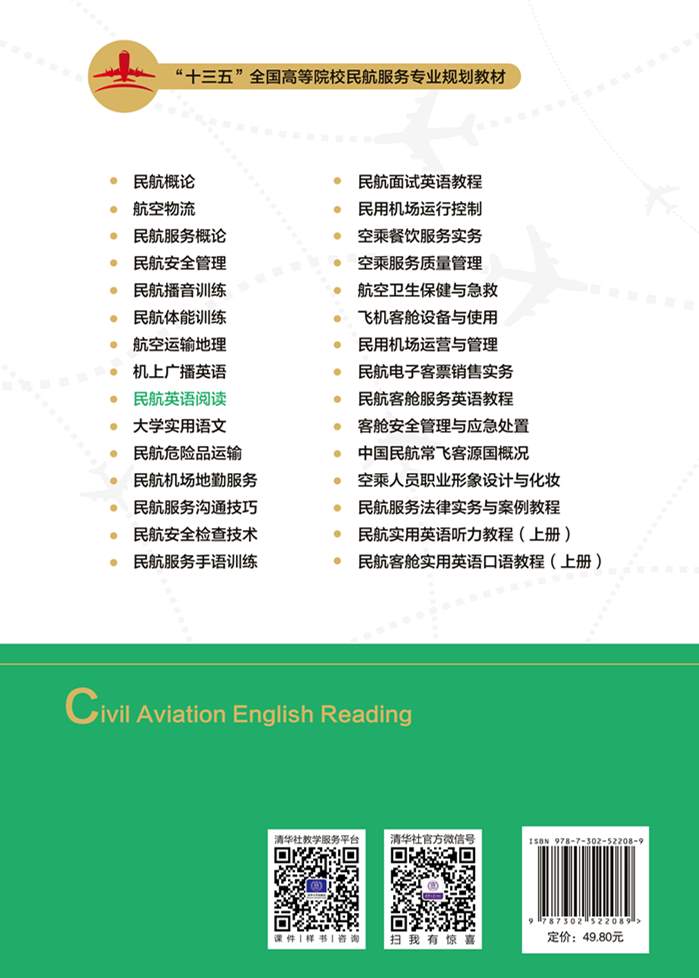 《民航英语阅读》是根据国际民航组织对乘务员、飞行员英语语言能力要求,结合国内航空公司对于乘务员、飞行员英语水平的要求和实际工作、训练需要而形成的具有飞行特色和时代特色的专业英语阅读教材。本教材融汇了国内现行大学英语阅读教材、其他文科教材和其他英语阅读教材的编写理念和模式,旨在帮助民航空中乘务、飞行技术、交通运输等专业的学生奠定民航英语基础知识,培养学生的民航英语综合应用能力。本教材从四个方面(语言、结构、词汇、理解)对学生进行语言能力的培养,有助于学生掌握专业知识、提高应用能力。本教材的编写全面贯彻国际民航组织的新语言标准。《民航英语阅读》在选材上立足于空中乘务专业、飞行技术专业、交通运输专业的学生及航空公司工作人员等英语学习者的专业英语学习阶段的语言基础和专业英语基础语言知识学习的需要。本教材强调“以学生自主学习为中心,教师适时引导”的教学原则,在选材上注重基础性、实用性、全面性、系统性和前瞻性。每课的内容自成体系,取材具有典型性,每课力求专业英语知识的系统性,以引导读者在课外进行相关英语语言知识的学习。