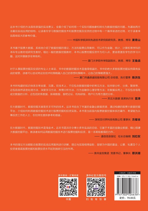 本书围绕股票挖掘所构建的知识体系非常全面完善。在技术上,不仅包含了数据挖掘中常见的方法,如匹配方法、关联分析、分类、聚类、预测、时间序列分析等,还包括自然语言处理方法、深度学习方法、舆情分析方法、行为金融学心理学等方法。在数据应用上,不仅包含了对场内每笔成交数据的分析,还包括财务数据、新闻数据、股吧论坛、机构研报、用户行为等方面的分析。