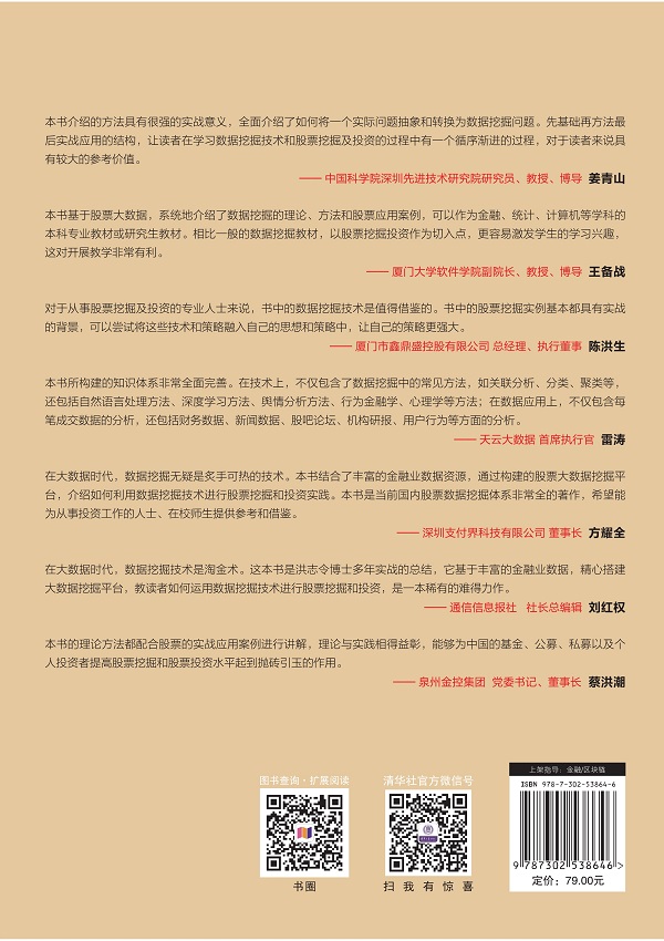 前言 投资股票是为了获得更大的收益,然而由于股票市场具有较大的动态特性,股票投资的收益与风险往往是成正比的,投资收益越高,存在的风险就越大。有效地进行股票价格的预测,最大限度地规避股票风险,增加投资收益,是股票投资者最关注的热点问题。 近年来,中国股市起起伏伏,熊冠全球,许多投资者伤痕累累,损失惨重,股市已成为大多数中国股民的伤心地。中国股市的现状是多方面因素共同作用的结果,作为普通的投资者无法改变这一现实,怨天尤人于事无补; 要想在股市中博弈,立于不败之地,只能从现实出发,从自身做起。 在股票交易事务处理中,每天有大量的交易信息数据汇入数据仓库,这些数据无疑有益于股民了解股市的走势,做出正确的投资决策,然而如何从海量数据中提取有用的并最终可理解的模式是投资者最为关心的问题。 在大数据时代,数据挖掘无疑是最炙手可热的技术。数据挖掘的作用是从大量的、不完全的、有噪声的、模糊的、随机的数据中提取隐含在其中的,人们事先不知道但又是潜在有用的信息和知识的过程。数据挖掘技术恰好解决了数据利用的问题,所以数据挖掘与股票投资便很自然地结合在一起。数据挖掘在国内也是一个新领域,加上较早之前计算能力的限制,所以还没有关于股票投资与数据挖掘相结合的相关书籍,以及股票大数据领域的规模应用案例。虽然有一些量化投资方面的著作,但是量化投资和股票挖掘还是存在相当大的差别。在这样的背景下,本书结合丰富的金融业数据资源,以及构建的股票大数据挖掘平台,介绍如何利用数据挖掘技术进行股票挖掘和投资实践。 首先介绍数据挖掘技术。数据挖掘是一个交叉学科,融合了统计分析、模式识别、机器学习、...