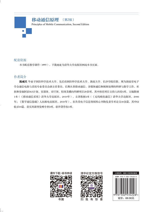 陈威兵:2002年毕业于国防科学技术大学,先后在国防科学技术大学、湖南大学、长沙学院任教。现为湖南省电子学会通信电路与系统专业委员会副主任委员,多年从事移动通信、多媒体通信和视频处理的科研与教学工作,承担和参加国家863计划、省部级、市厅级、校级及横向科研项目20项,其中担任项目主持人的有6项。主编教材1本(《移动通信系统》,2010年),主译教材两本(《无线蜂窝通信》,2008年;《数字通信基础》,2010年),在各类电子信息核心刊物发表学术论文40余篇,其中EI收录10篇。获实用新型发明专利3项,软件著作权1项。